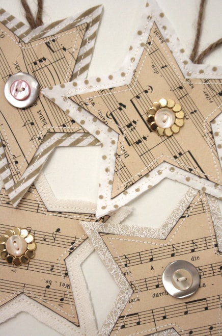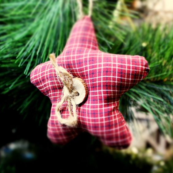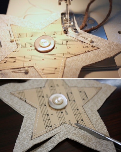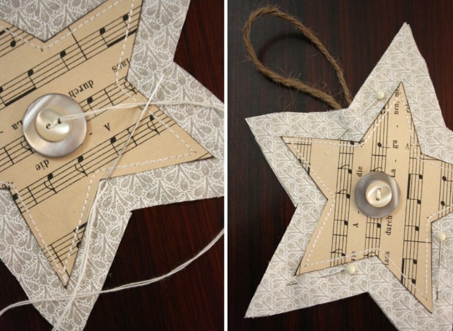 Coudre un bouton à l'une des étoiles. Après cela, nous les connectons de sorte que les côtés du tissu soient à l'intérieur. Entre eux, nous mettons de la ficelle pour former une boucle. Nous fixons la structure avec des épingles et cousons.