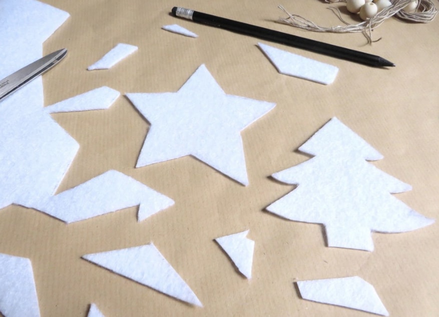 Sur feutre, dessinez les formes nécessaires. Dans cette classe de maître, il s'agit d'un sapin de Noël et d'un flocon de neige.