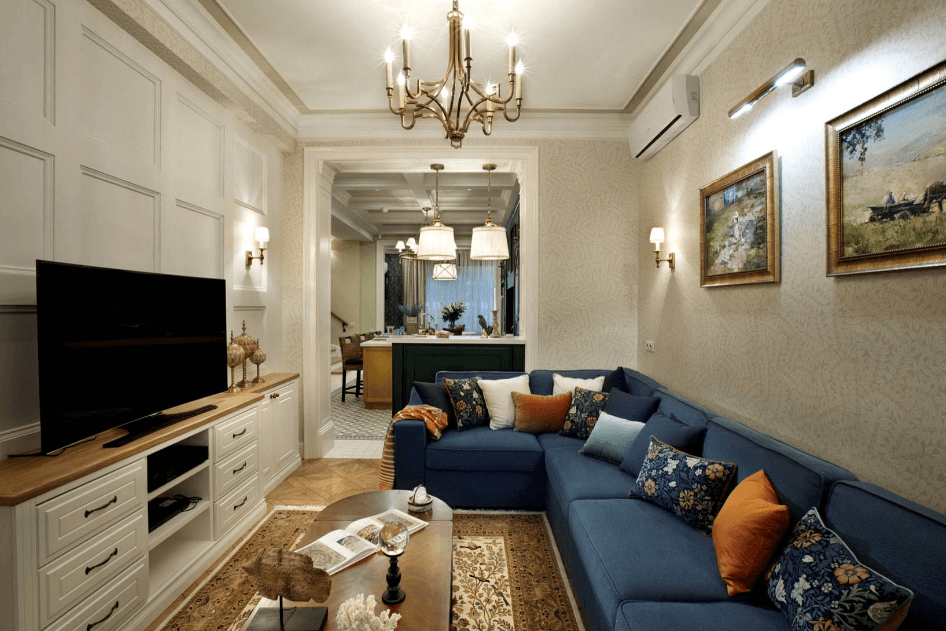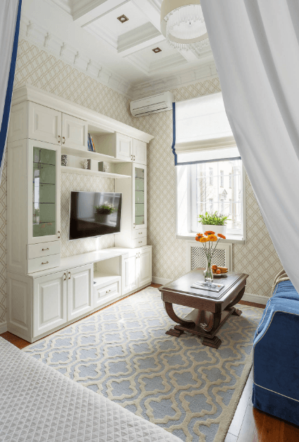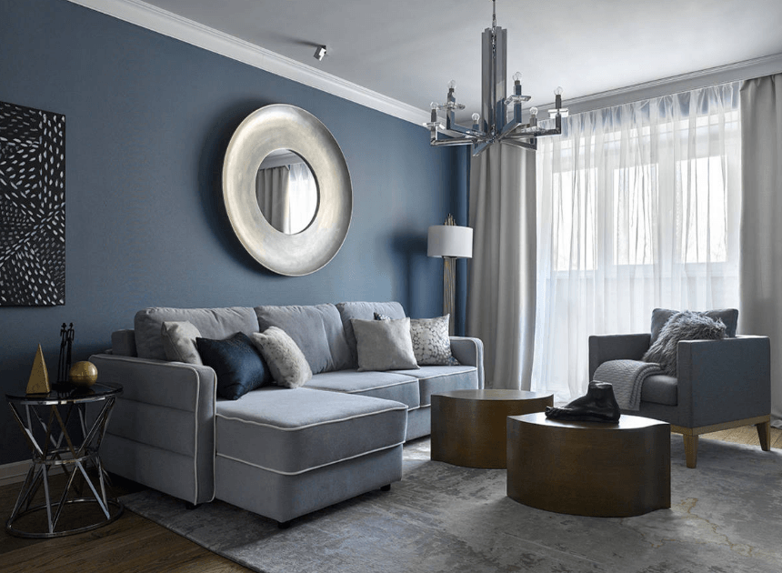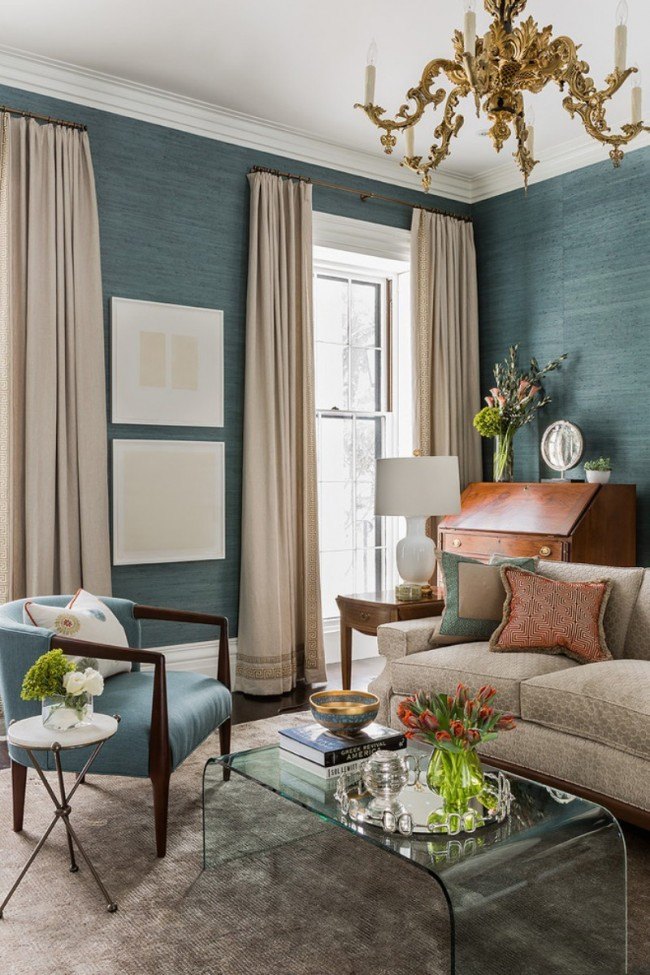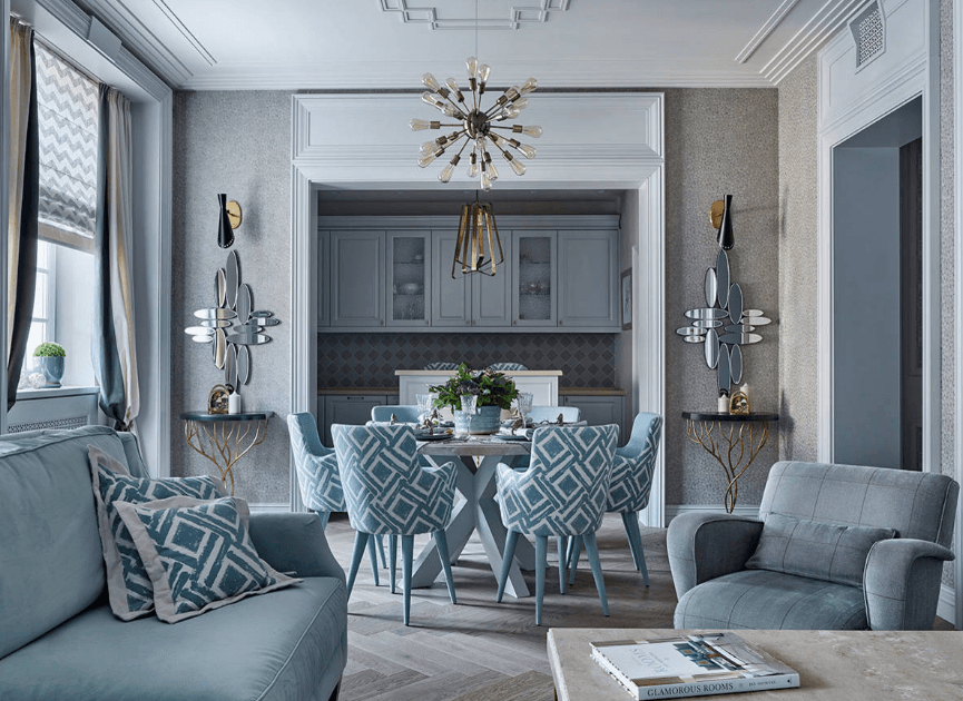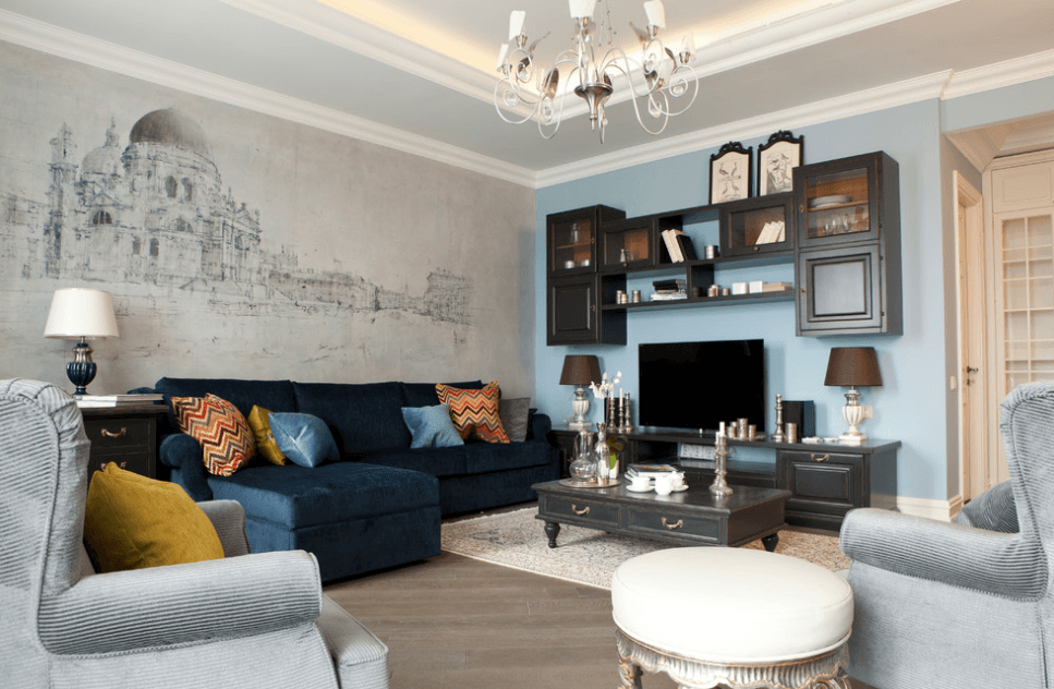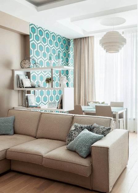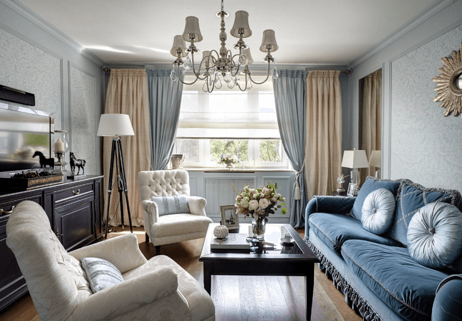 La palette de nuances de bleu sera plus pertinente que jamais. Après tout, de tels tons sont parfaits pour décorer un salon. Il semble assez concis, mais en même temps élégant. Par conséquent, de nombreux concepteurs recommandent de choisir le bleu pastel comme couleur principale du papier peint. Si vous souhaitez une option combinée, vous pouvez utiliser des nuances plus vives ou un motif approprié. Ils donnent la vivacité intérieure et en même temps rendent le salon plus raffiné.