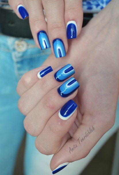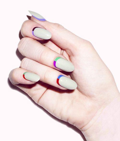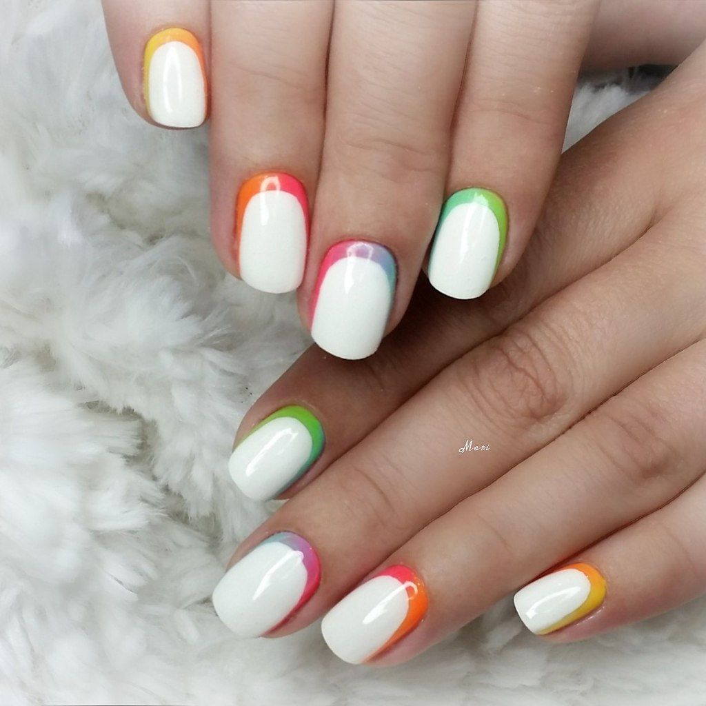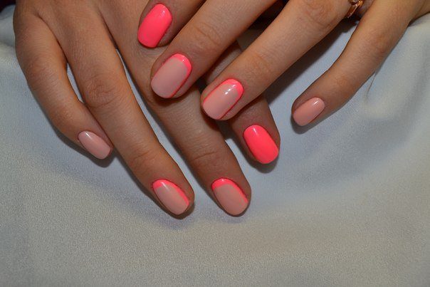 Le deuxième type de manucure française inversée est multi-couches. Contrairement à la version précédente, vous ne pouvez pas créer plusieurs bandes contrastantes. C'est vraiment très beau, surtout si vous combinez plusieurs nuances. En passant, vous pouvez utiliser les couleurs vives de l'arc-en-ciel si vous le souhaitez. Ceci est une excellente idée de conception de clou pour la saison estivale. Une manucure multicouche faite en deux teintes est également très intéressante.