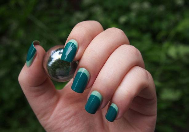 Si vous envisagez de créer une veste inversée multicouche, cela sera un peu plus compliqué. Initialement, les mêmes étapes sont répétées comme dans la version précédente. Après avoir appliqué la couleur de base, un gabarit doit être fixé à la base de l'ongle. Remplissez l'espace libre avec l'une des nuances du vernis et attendez qu'il soit complètement sec ou utilisez une lampe. Cela dépend du vernis que vous utilisez.