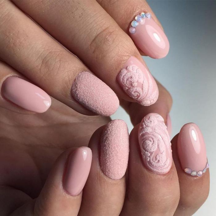 Le sable spécial pour manucure est une excellente solution pour les amateurs de motifs. Ils peuvent être appliqués à quelques ongles comme un accent ou pour couvrir chacun d'eux. De plus, le sable est souvent utilisé pour créer un motif "tricoté". C'est vraiment très beau.