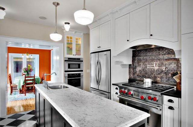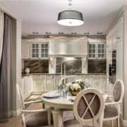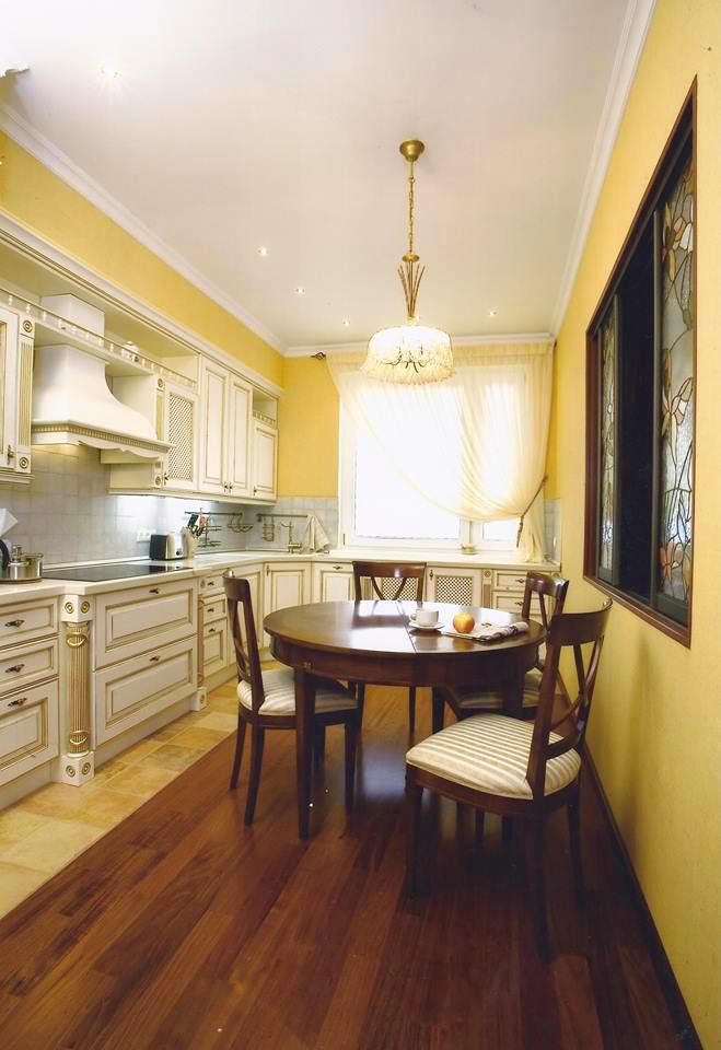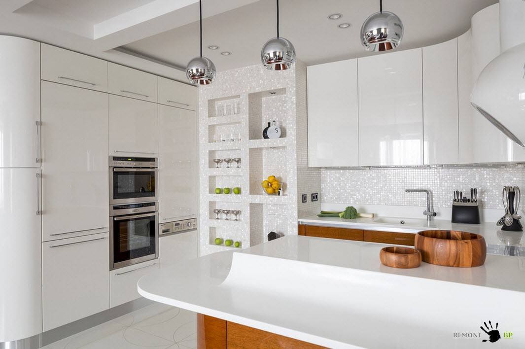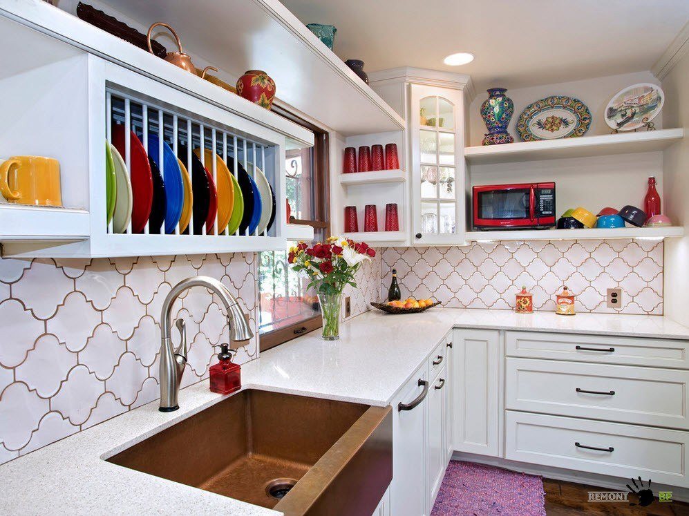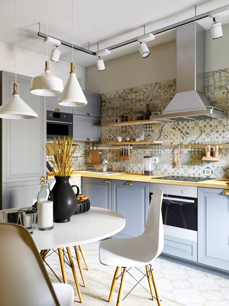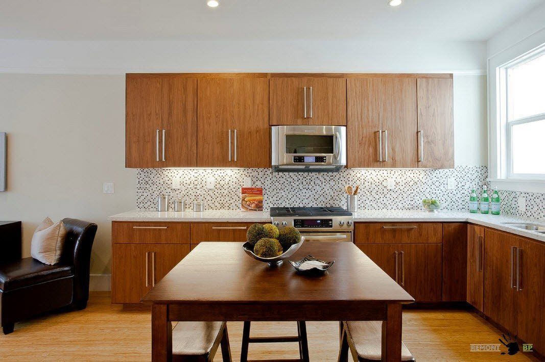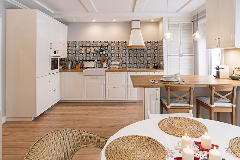 Les carreaux de céramique peuvent avoir différentes couleurs et formes. Le style moderne de la cuisine implique l'utilisation de motifs carrés et hexagonaux. Dans la conception classique, plusieurs options décoratives peuvent être utilisées.