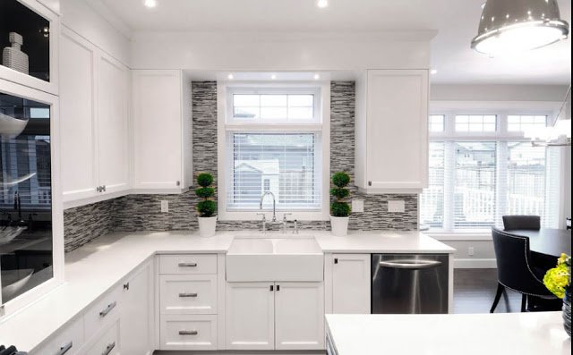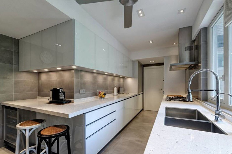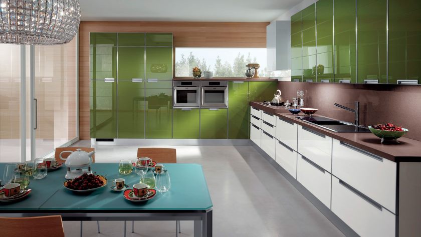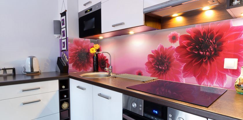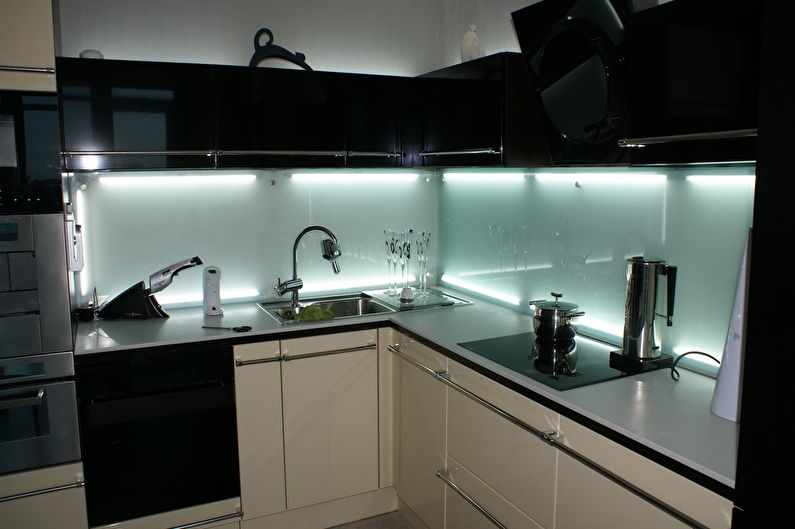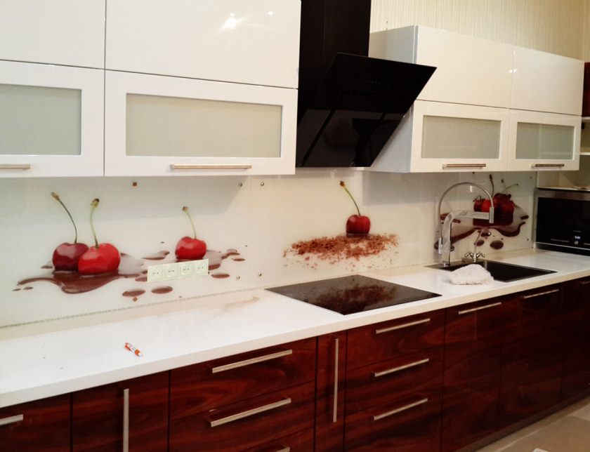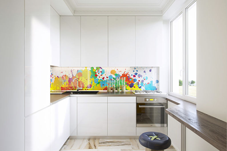 La conception d'un tel revêtement peut être monophonique ou imiter la texture d'autres matériaux. L'impression de photos est utilisée pour donner de la luminosité à la zone de travail. L'inconvénient de ce matériau de finition est son prix élevé et la nécessité de passer une commande en fonction de la taille du tablier, ce qui est associé à la complexité du processus de découpe du verre.