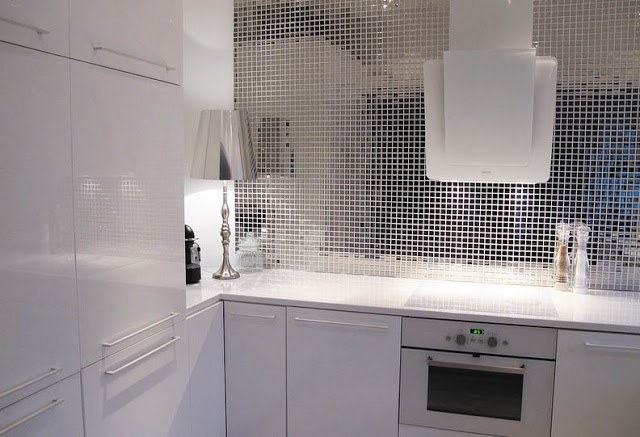 La composition en mosaïque a toujours l'air compliquée et élégante. Il peut être utilisé pour créer des motifs abstraits, divers motifs ou couleurs. Le matériau de ces pièces peut être très différent, ce qui affectera non seulement l'apparence du tablier, mais aussi ses propriétés pratiques.