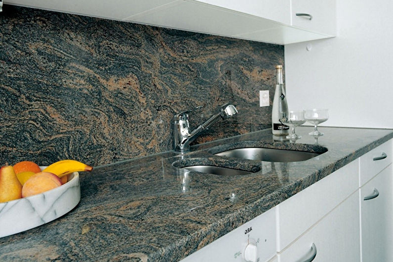 Un tel matériau peut être à la fois naturel et artificiel. La première option n’est pas courante, car elle n’est pas assez durable et coûte cher en même temps. Le plus écologique et le plus durable est le granit.Le marbre aura l'air noble sur le mur, cependant, en raison de l'humidité excessive dans la pièce, il peut rapidement perdre son aspect attrayant.