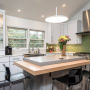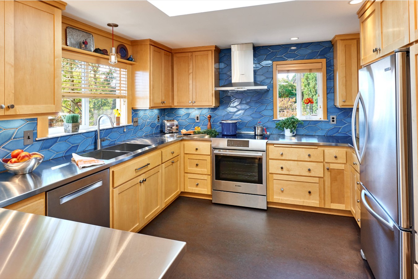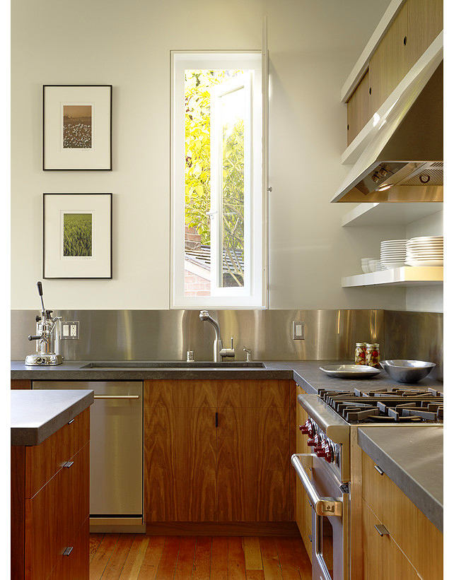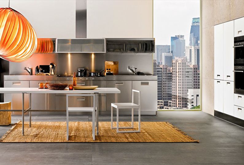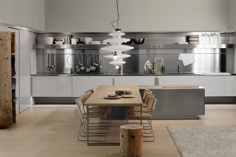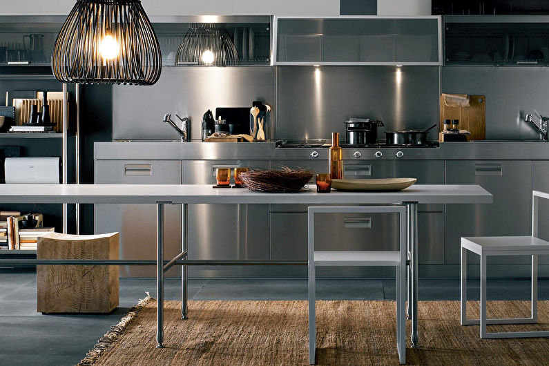 Pour concevoir une cuisine dans le style du minimalisme, de la haute technologie ou du grenier, l’acier est idéal. Un tel tablier fait référence à des options exclusives. Cela rend la pièce élégante, chère et même un peu officielle. Par conséquent, pour lui donner de la "chaleur" et une atmosphère chaleureuse, l’acier est combiné au bois.