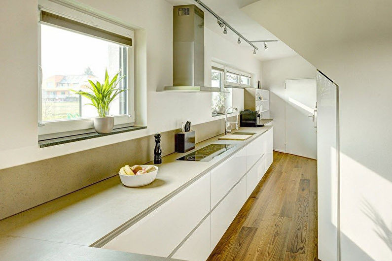 Moins cher et plus pratique d’utiliser des homologues artificiels dans la cuisine. Les produits en quartz ou en acrylique ne se prêtent pas à la déformation, à l'absorption d'humidité et ressemblent esthétiquement au mur de la cuisine. Un tablier en plâtre ne peut pas durer longtemps s'il est en outre traité avec un vernis spécial.