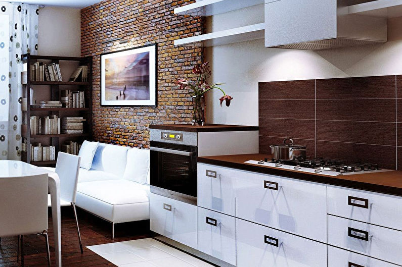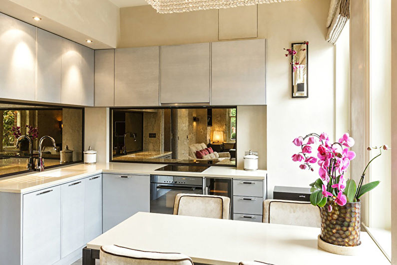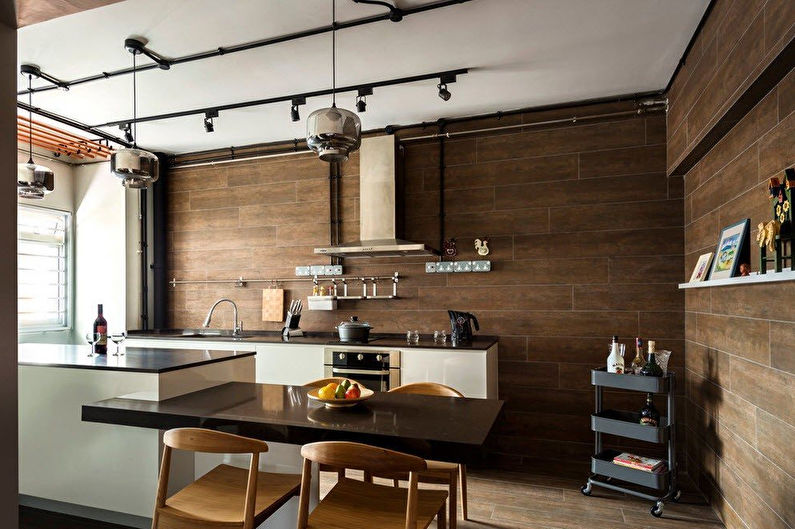 La surface sombre est considérée comme peu pratique. Mais si vous décidez toujours de saturer le tablier, vous devez "étouffer" le reste de la cuisine. Pour allonger visuellement la pièce, utilisez des rayures horizontales. Une surface de miroir rendra la cuisine plus volumineuse.