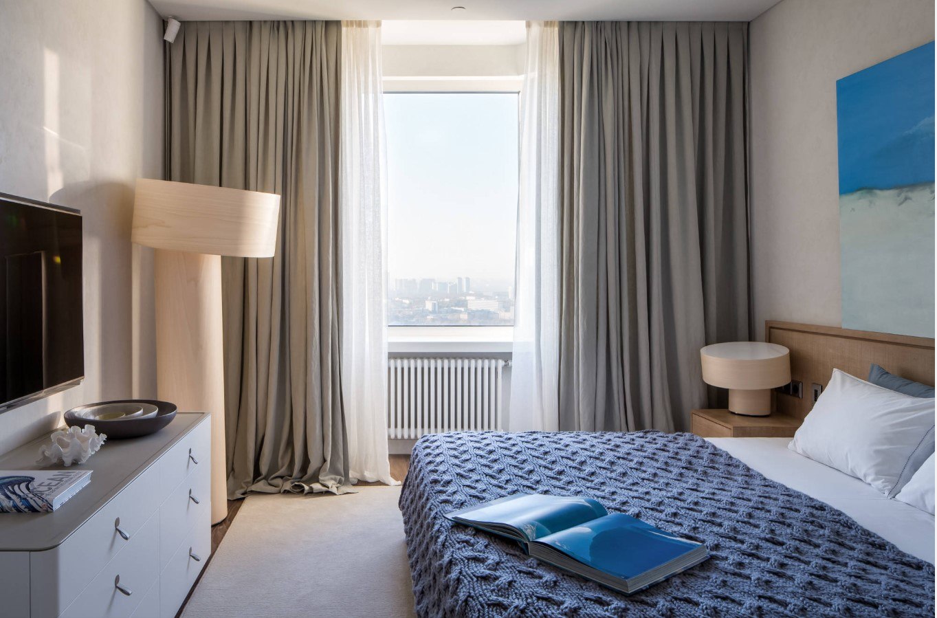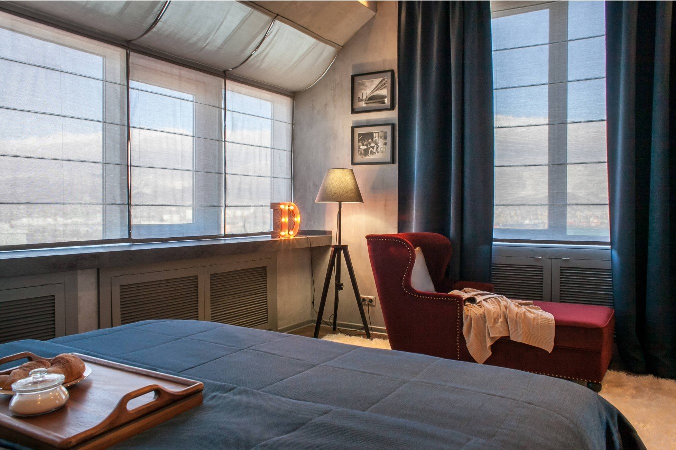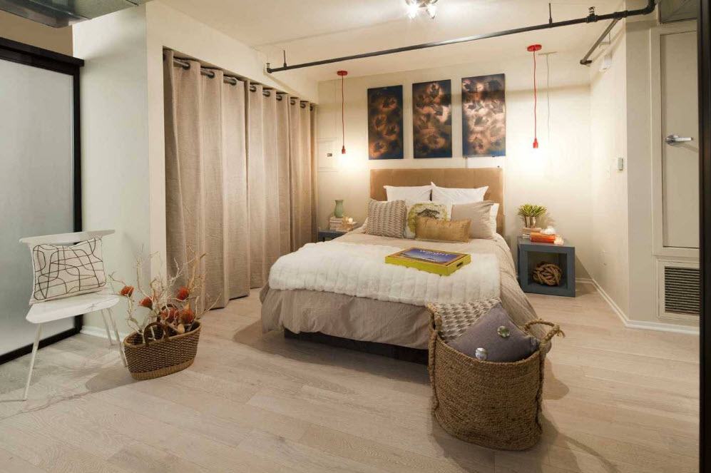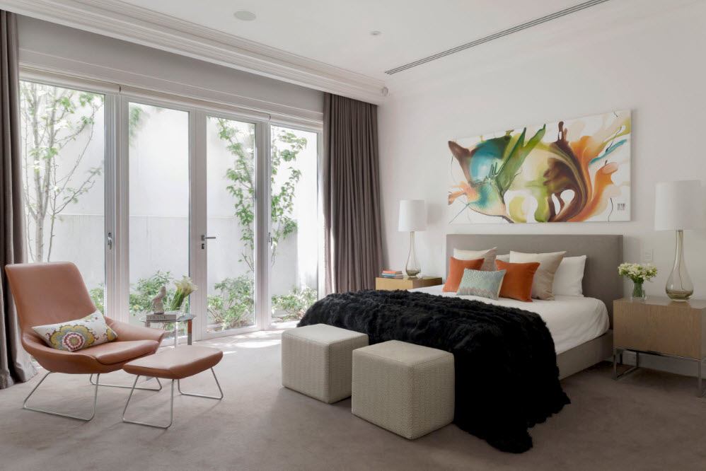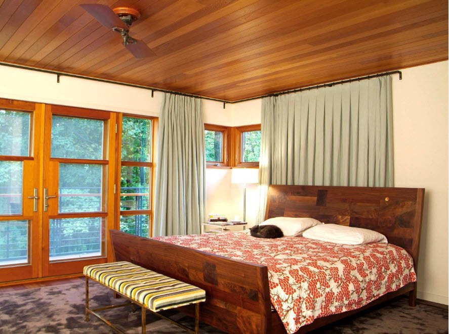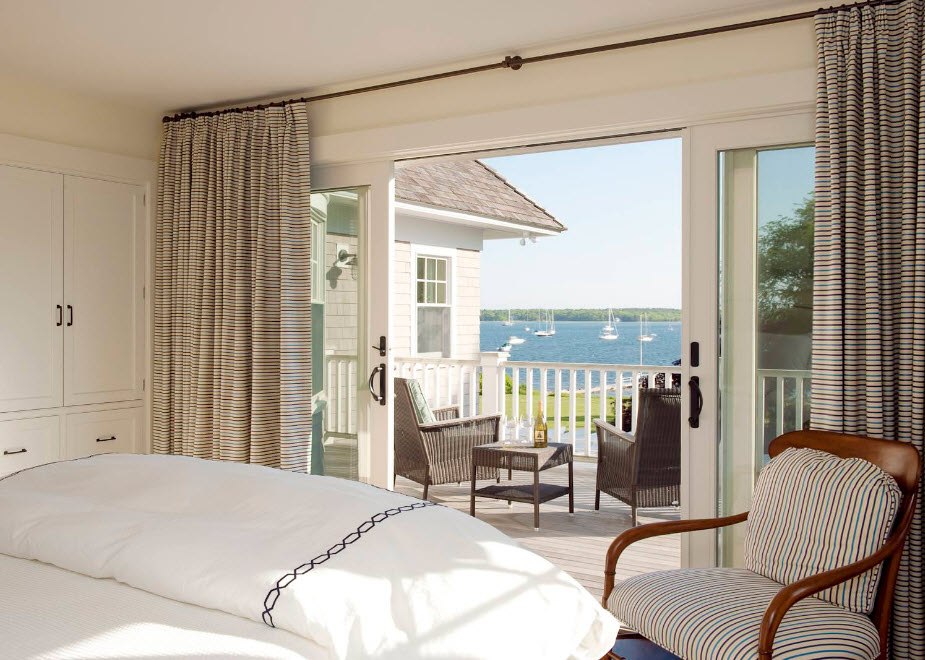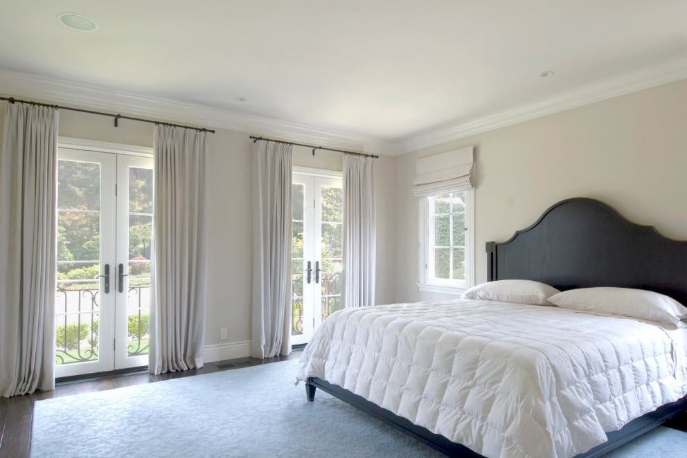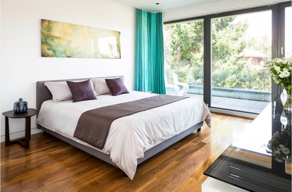 Chambre à coucher avec baie vitrée est une option difficile à mettre en œuvre. Dans cette zone, des feuilles de protection ou des stores peuvent être disposés et la pièce est décorée de rideaux aux teintes plus sombres.