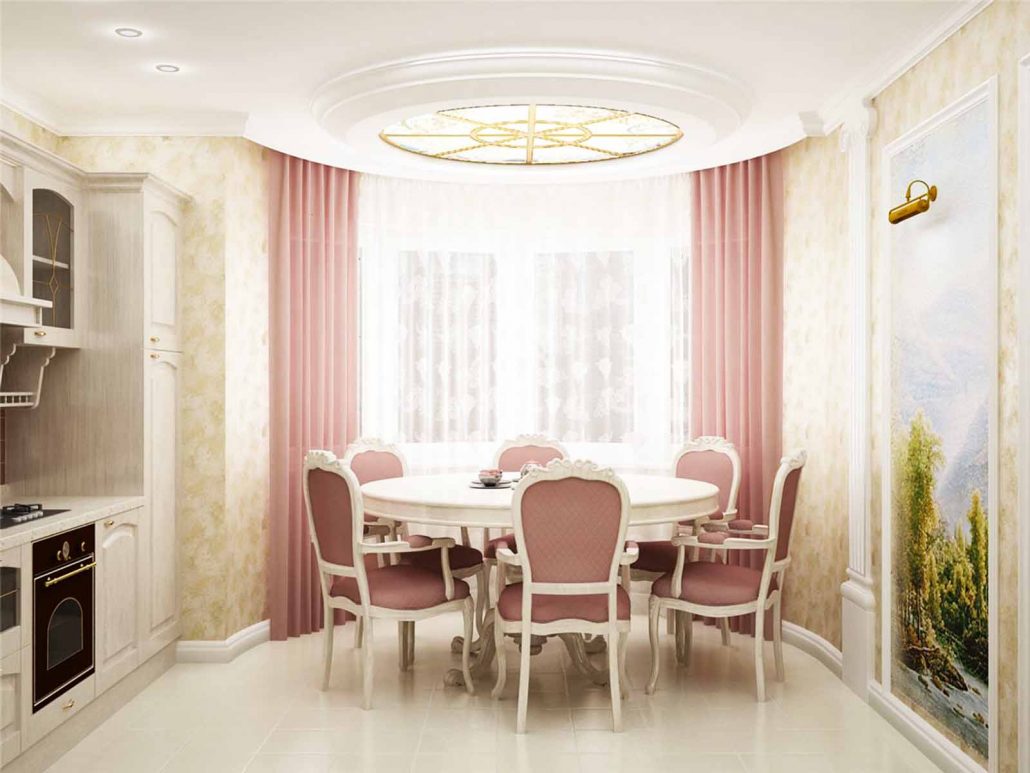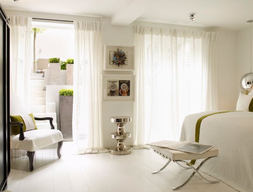 Le type de fenêtre revêt une grande importance, qu'il s'agisse d'une porte de balcon ou non, d'une fenêtre panoramique ou d'une fenêtre ordinaire. Vous pouvez créer une atmosphère romantique et légère avec un tulle blanc comme neige, orné d’un motif orné.