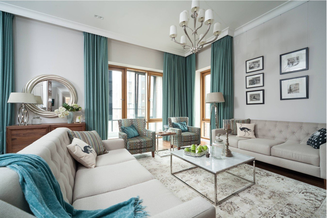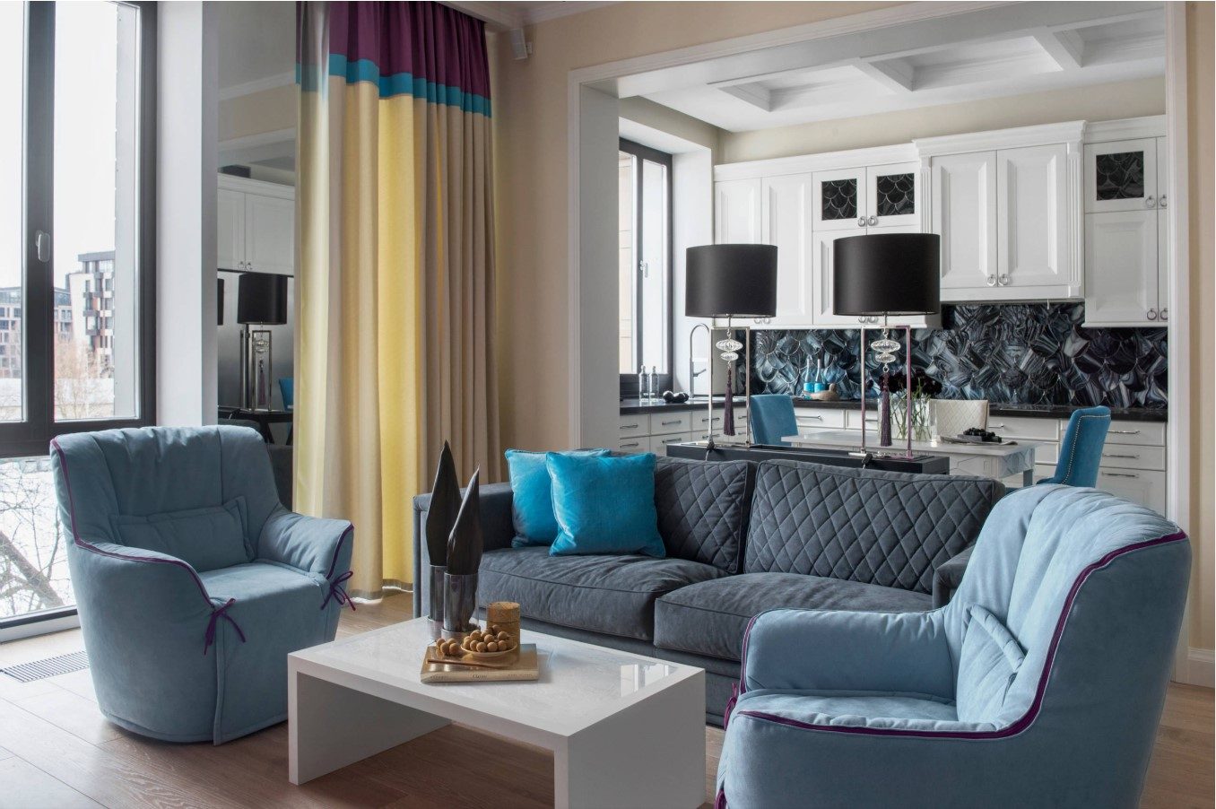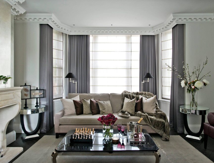 La fenêtre peut être laissée complètement ouverte ou seul un tulle transparent peut être suspendu si le salon est fait dans le style loft. Il aura fière allure des stores ou des volets roulants.