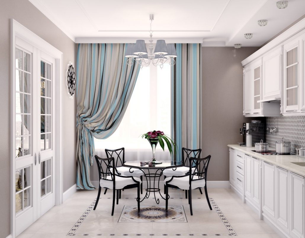 Il vaut la peine de refuser de froisser une magnifique draperie, car même la hotte la plus moderne et la plus fiable ne peut pas protéger de l’accumulation des odeurs de cuisine et de la suie.
