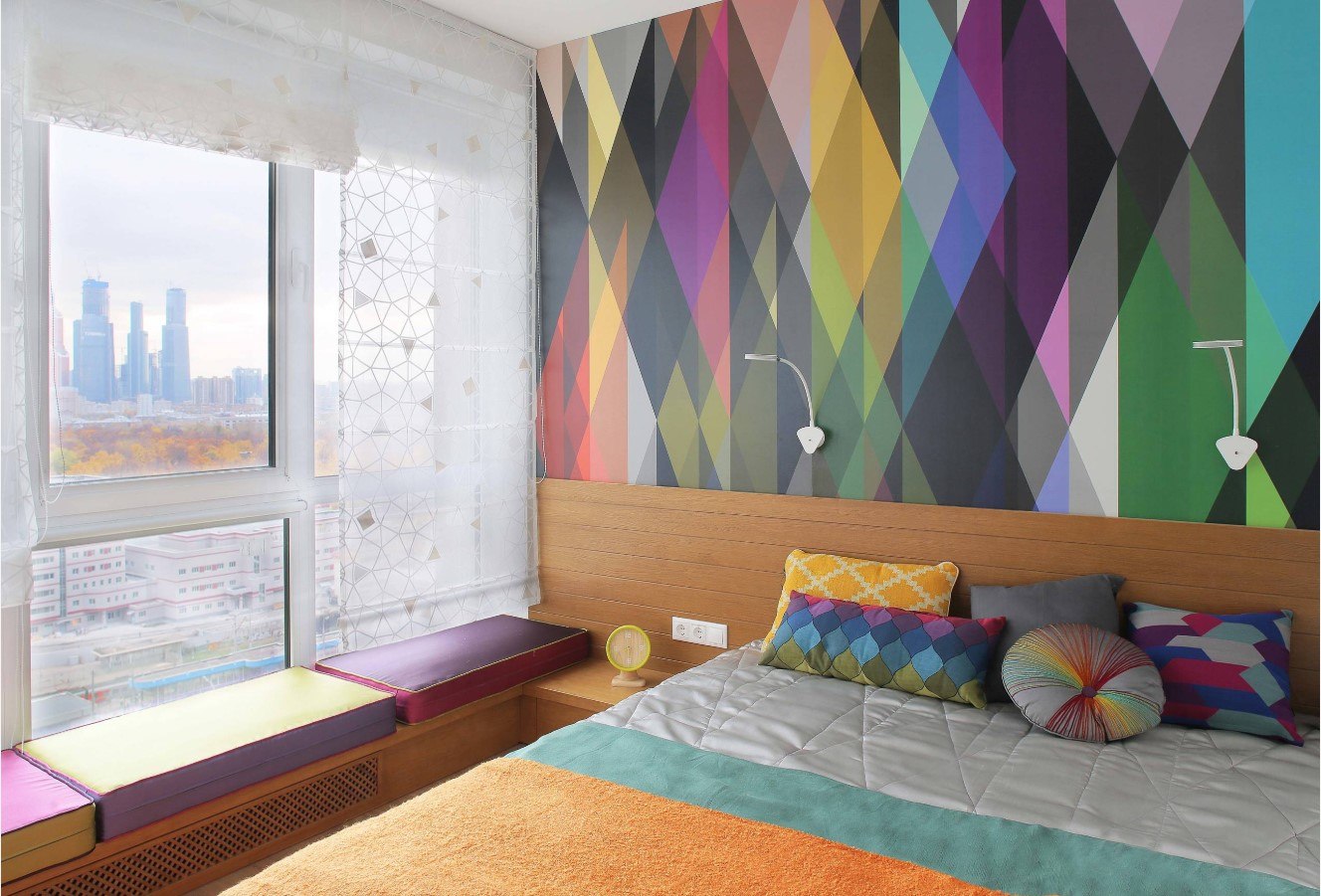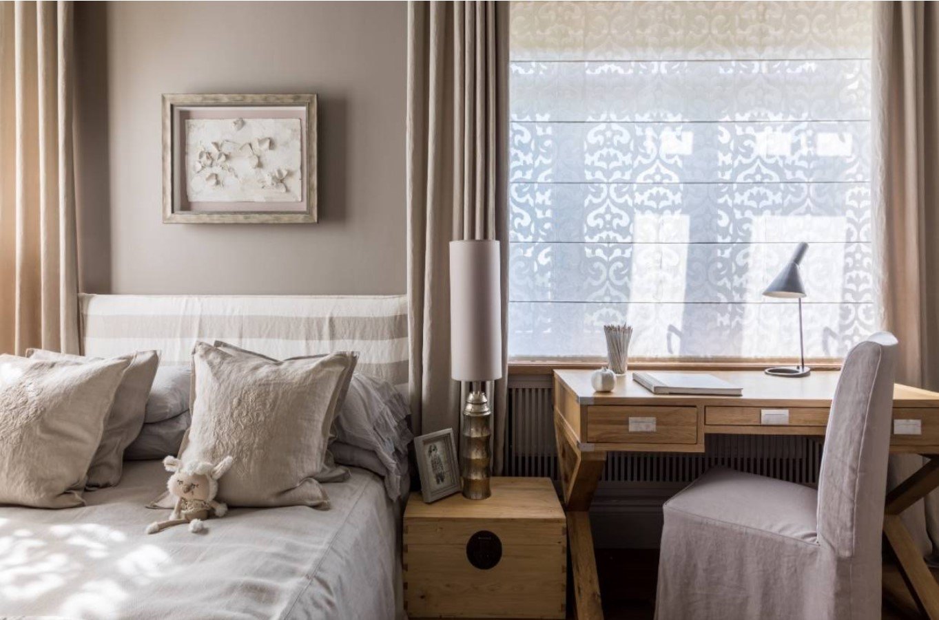 Lors de la création d’une fenêtre dans la chambre, les textiles choisis sont les mêmes que sur le lit. C'est une technique de conception populaire qui recrée une image complète et harmonieuse.