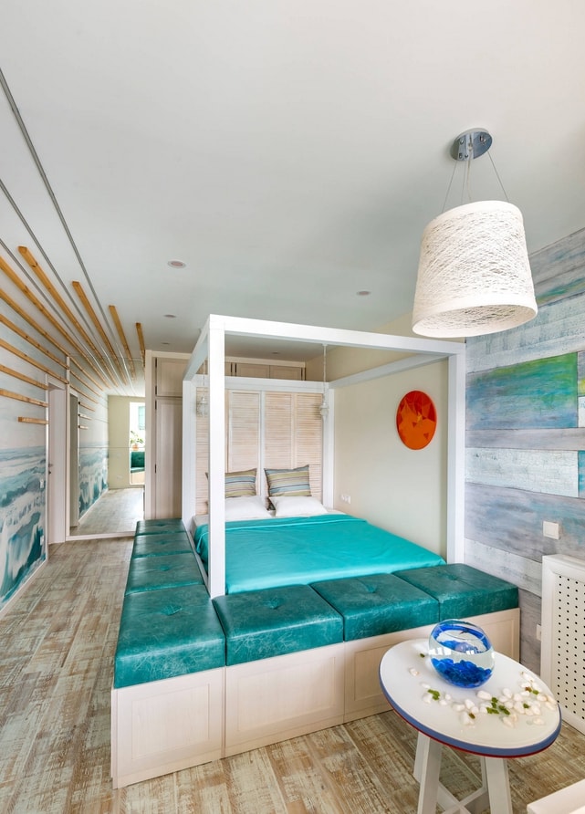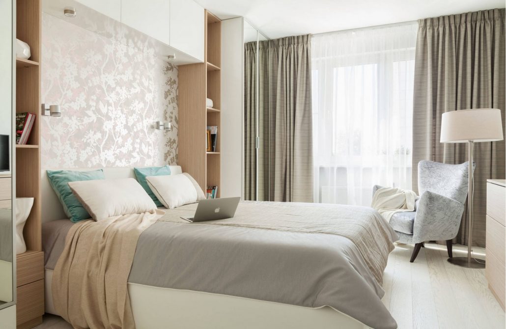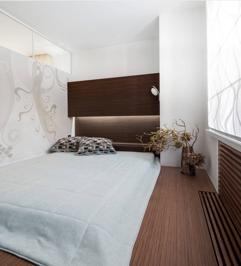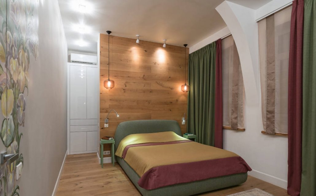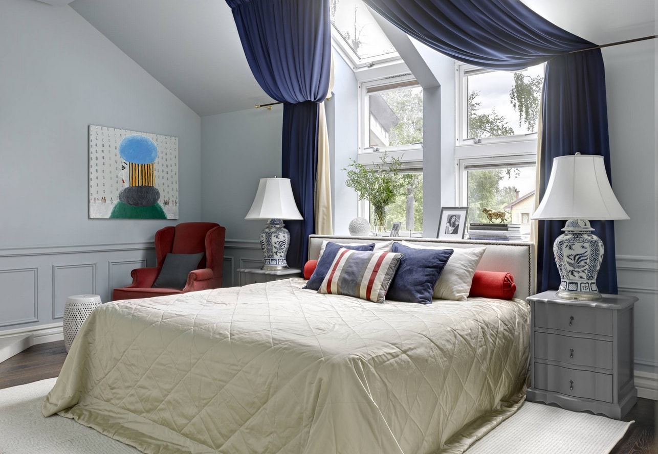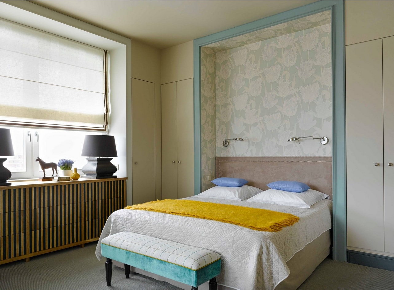 Jusqu'à cinq couleurs différentes peuvent être combinées dans la même pièce. L'ombre de la chambre à coucher est choisie de manière à ce que les murs soient plus clairs que les meubles et que les meubles eux-mêmes soient plus sombres que le sol.