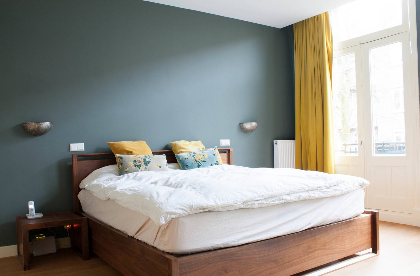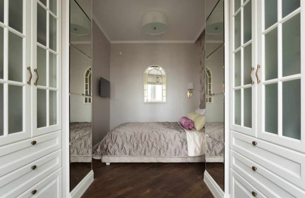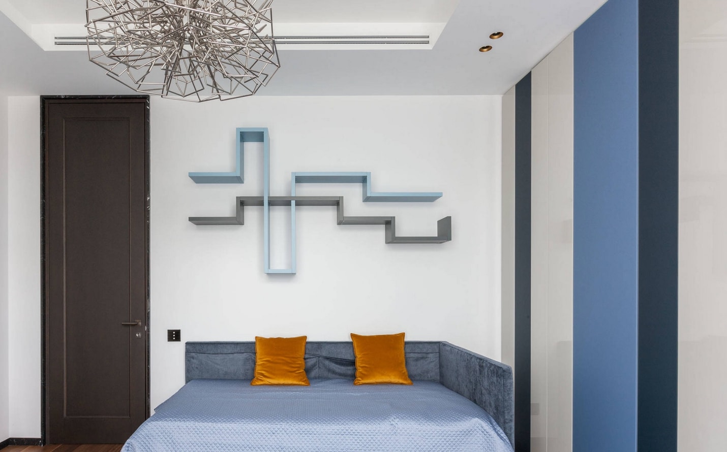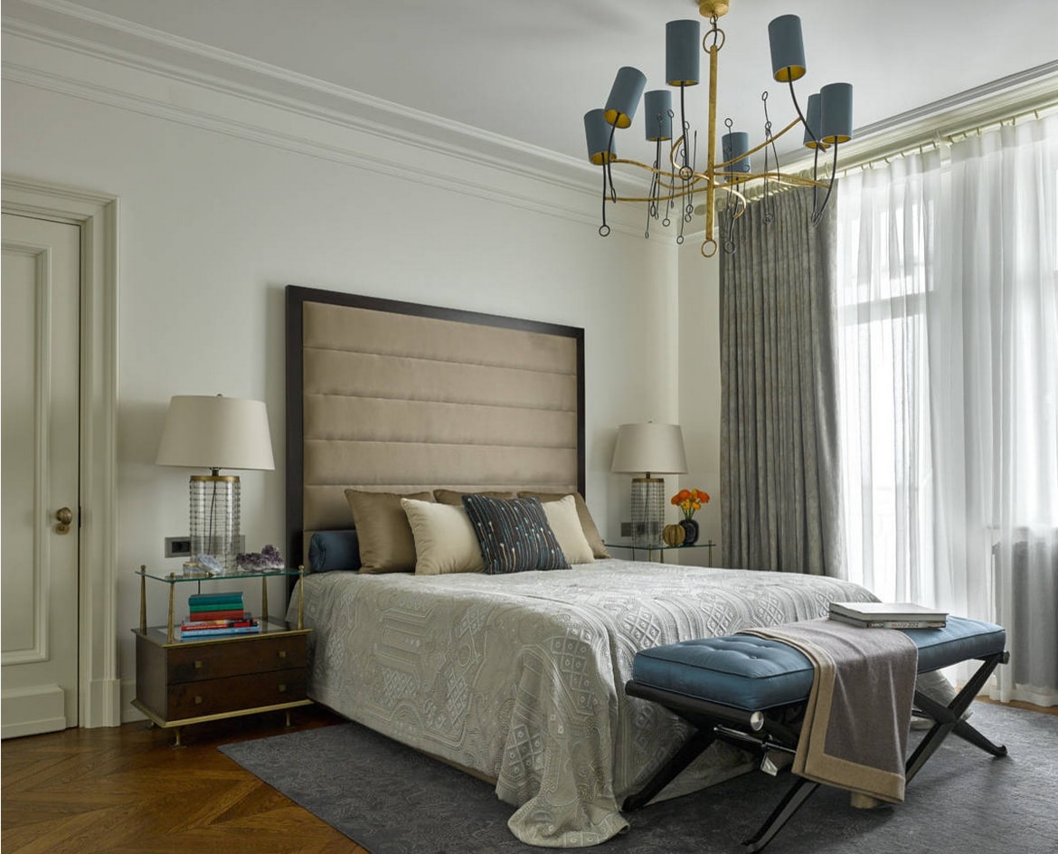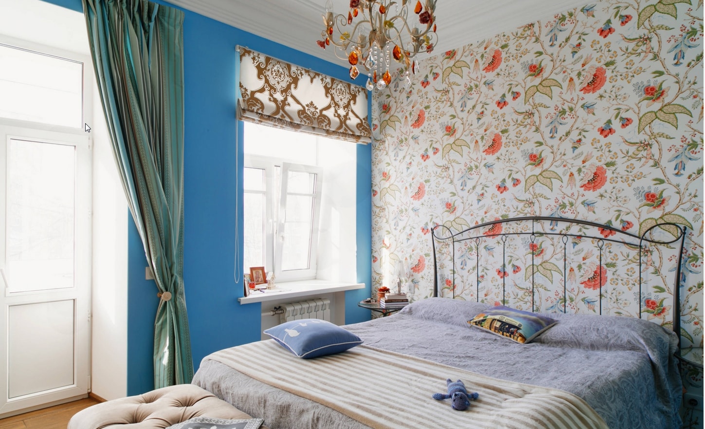 Jusqu'à cinq couleurs différentes peuvent être combinées dans la même pièce. L'ombre de la chambre à coucher est choisie de manière à ce que les murs soient plus clairs que les meubles et que les meubles eux-mêmes soient plus sombres que le sol.