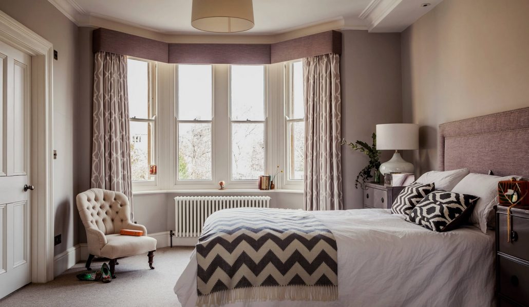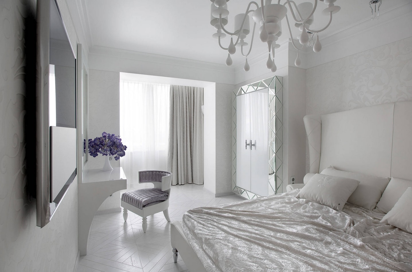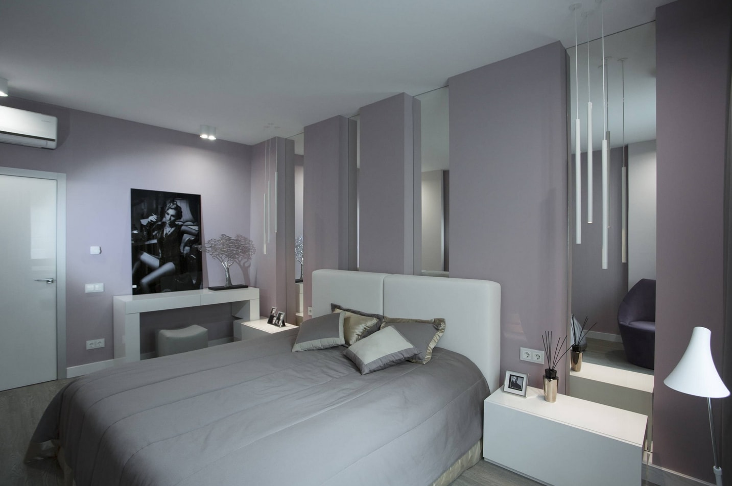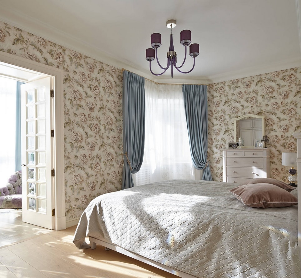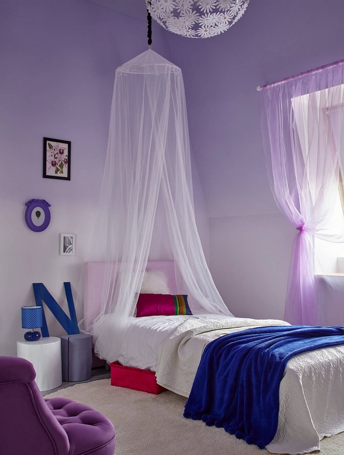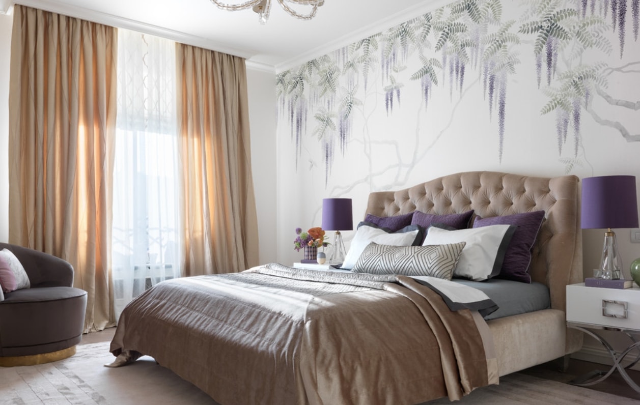 Les murs lilas conviennent aux meubles clairs. Cette couleur est idéale pour les petites chambres. Il va bien avec les fleurs laitières, beiges et roses.