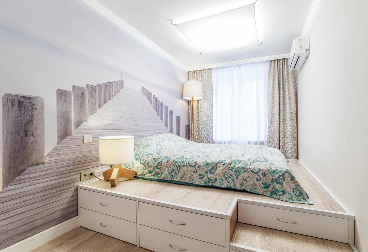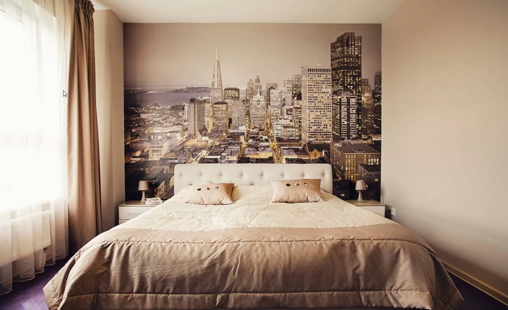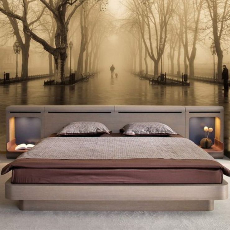 Les peintures murales gagnantes sont plus visibles sur les murs de la chambre que dans les autres pièces. Ils vont agrandir visuellement une petite pièce. Sur le mur, ils peuvent être appliqués en plusieurs parties ou en tant que toile entière.