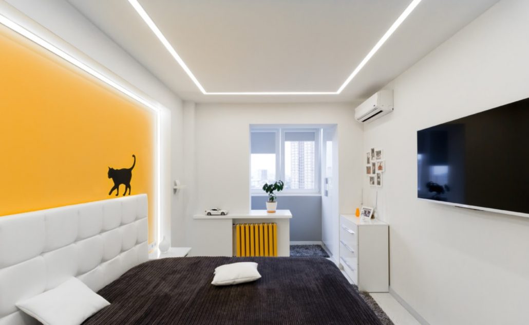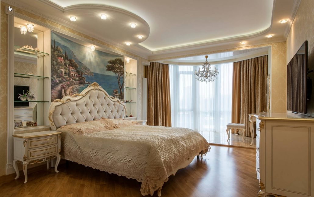 À la tête du lit, vous pouvez créer une niche à partir de cloisons sèches. Ainsi, l'apparence de la pièce est mise à jour.Cette solution constructive n'a qu'une fonction esthétique. Décorez-le avec des miroirs, du plâtre, du papier peint photo, du tissu.