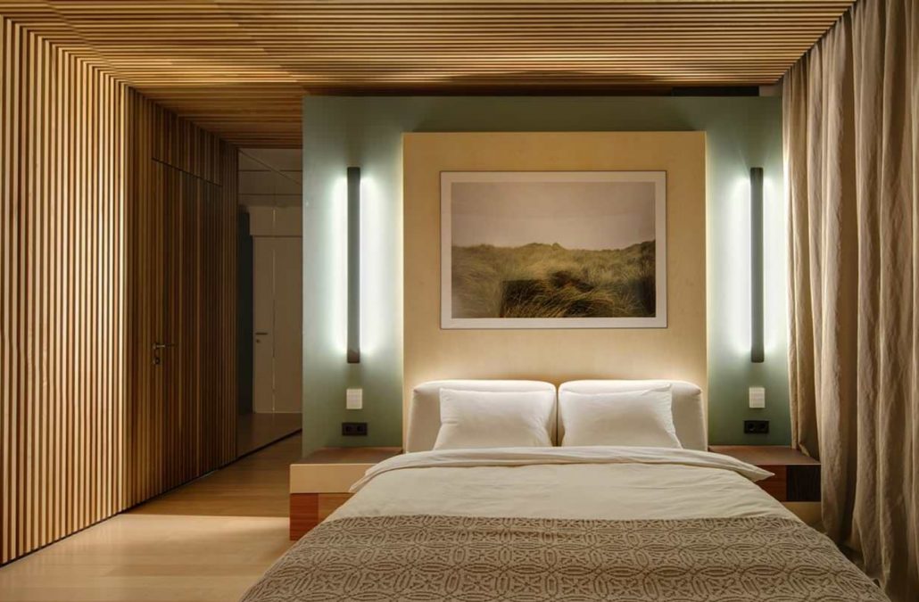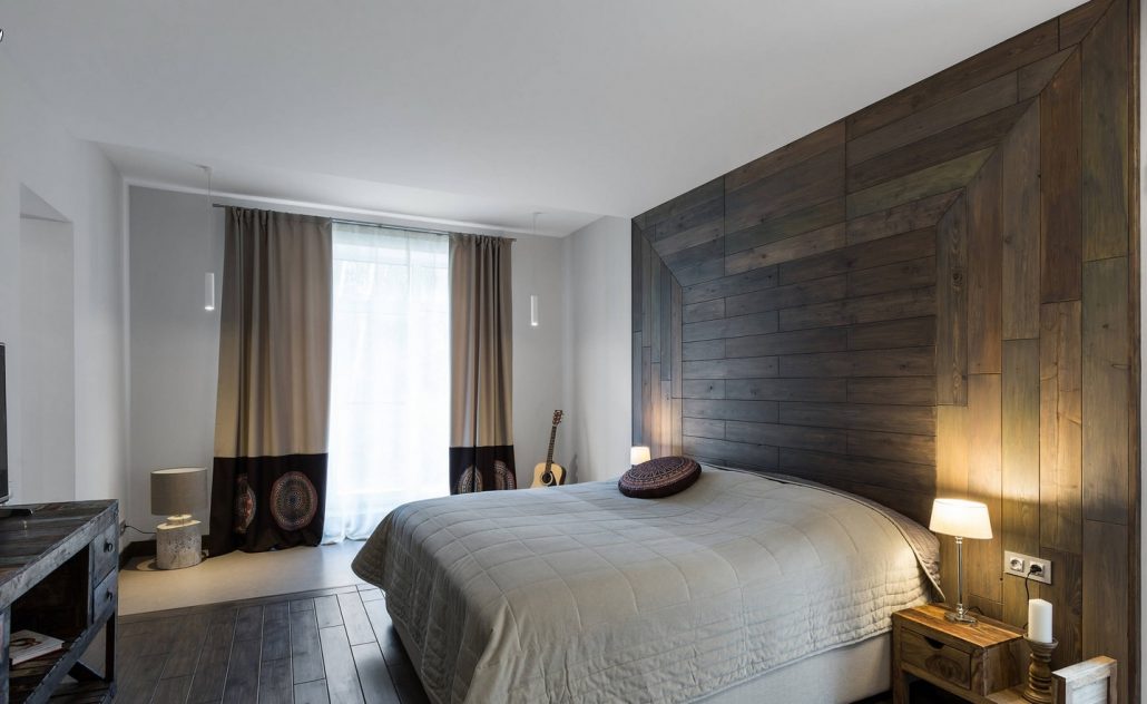 Pour un style écologique, un mur en bois au-dessus du lit convient. Il est fait de panneaux de bois, de planches. Son installation est assez simple, l'alignement des murs n'est pas nécessaire et tous les fils et les communications sont cachés en parallèle. Prendre soin de cette couverture ne sera également pas une préoccupation. C'est beau quand un tel mur est complété par des peintures ou des sculptures.