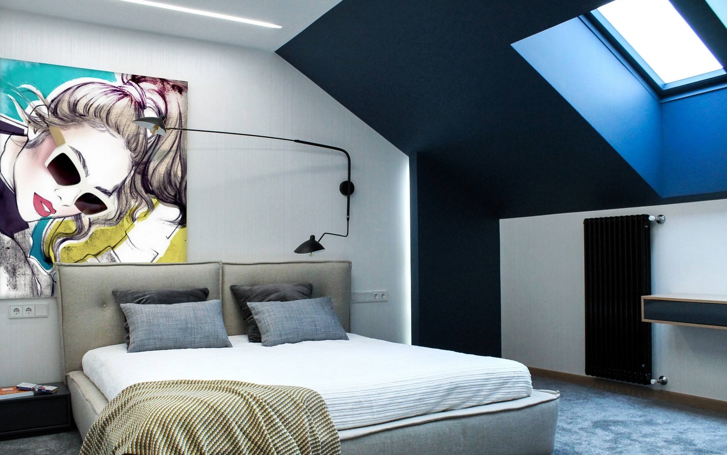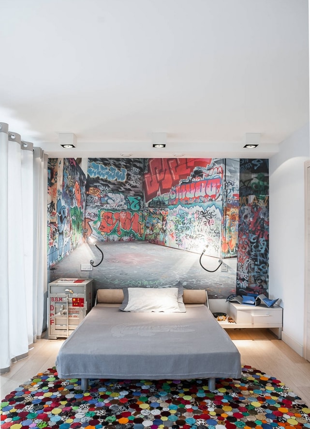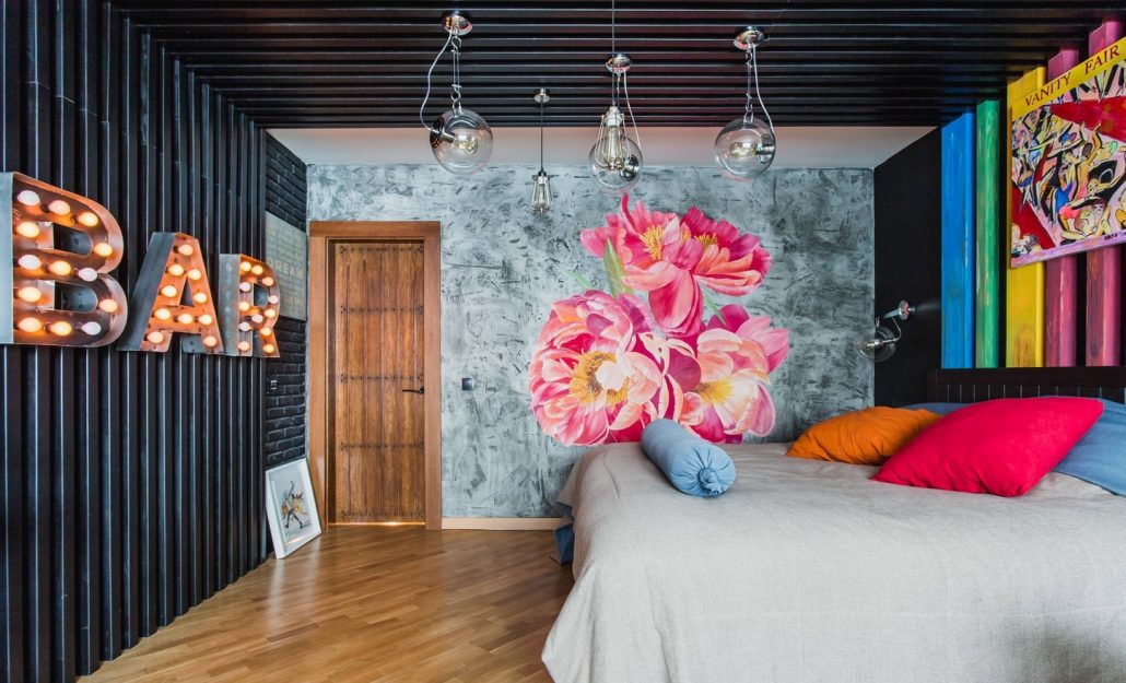 Une chambre de tout style peut être décorée avec de la peinture. On utilise de la peinture acrylique et le dessin est appliqué à l'aérographe. Cela peut être un portrait photo, un effet de dégradé, un graffiti, un motif, une peinture.