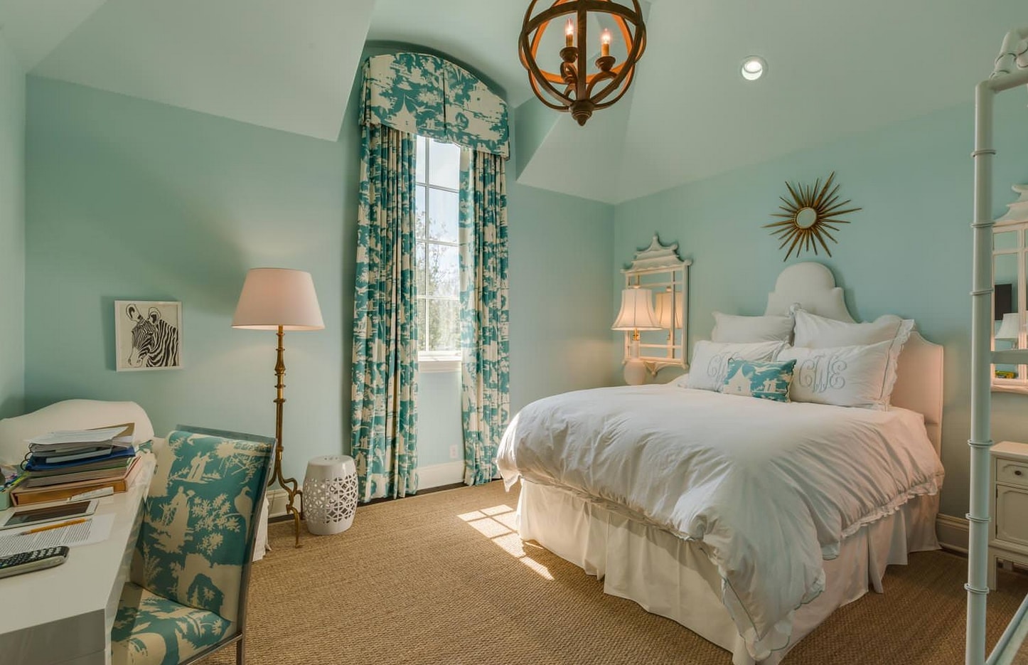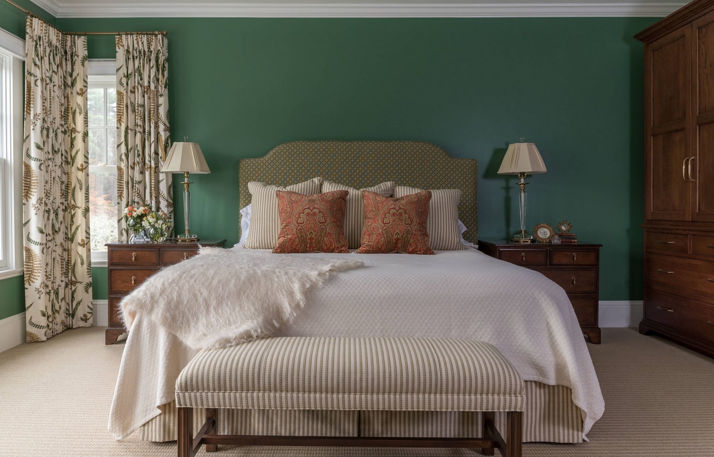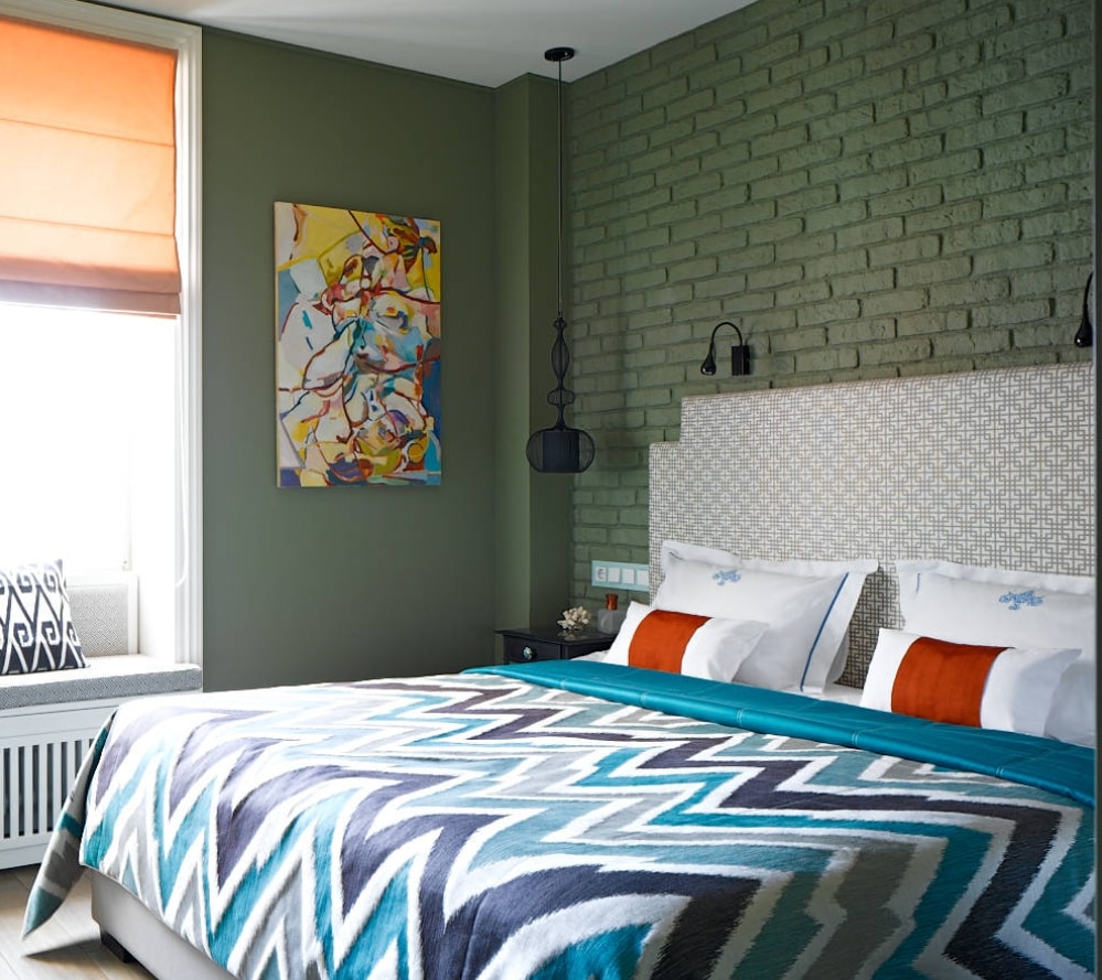 Pour les problèmes de sommeil, la chambre doit être décorée en vert. Ses nuances conviennent - olive et pistache. Le vert va bien avec les couleurs beige, marron, gris et les meubles en blanc.