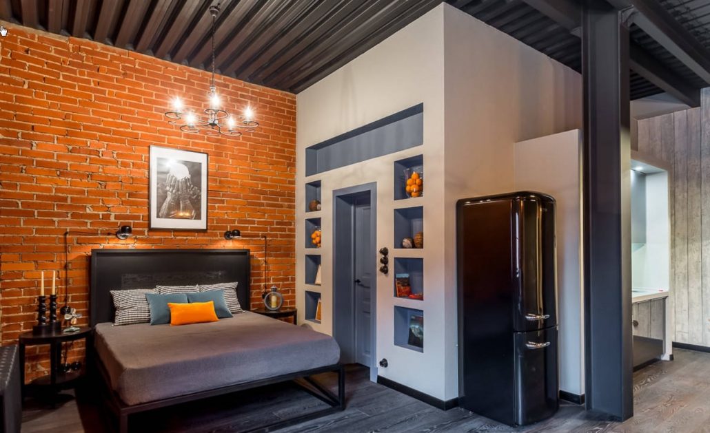 Un mur de briques s'intégrera parfaitement dans le style loft. Dans la chambre à coucher, elle sera un symbole de romance, de créativité et de brutalité. Ces qualités sont obtenues en utilisant la couleur des briques et des textures.
