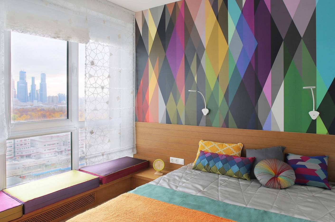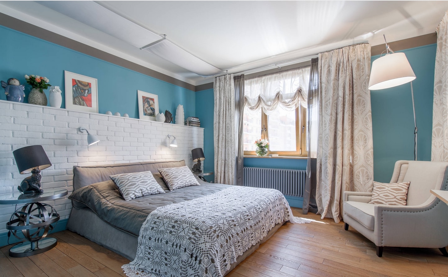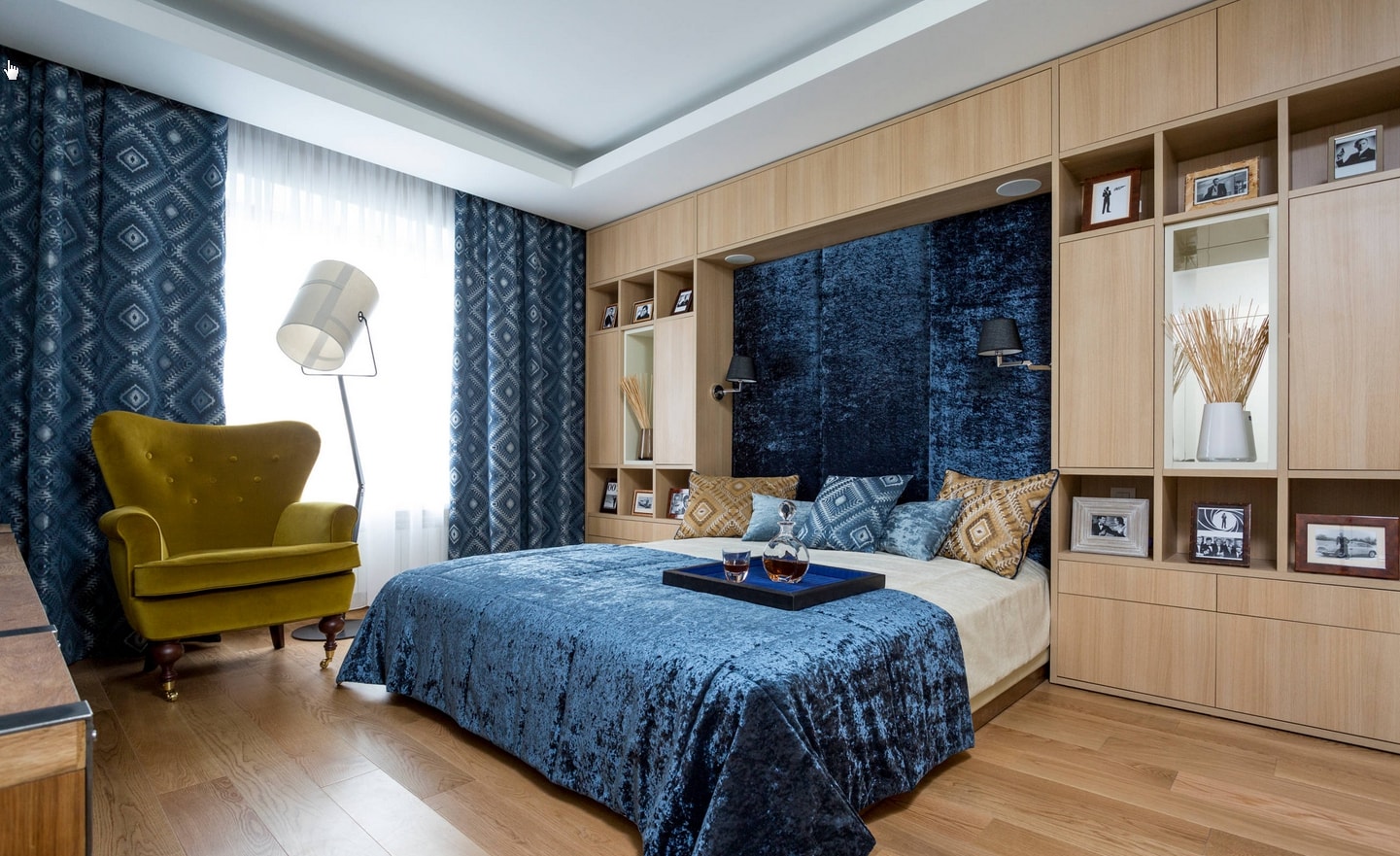 Dans la chambre à coucher, le mur au-dessus du lit peut devenir un objet de manifestation de fantasmes et de créativité. Il est décoré avec des panneaux photo, des cadres, des peintures, des textiles, du bois. Mur d'accent apportera une couleur, une forme et une texture individuelles au design général de la chambre à coucher.