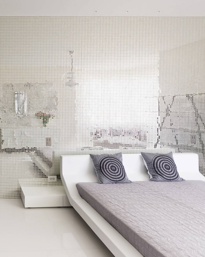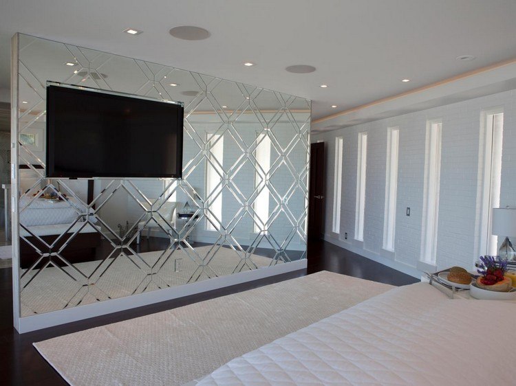 Il met en valeur le style de la pièce, la rend plus lumineuse, lève le plafond, augmente l’espace - un miroir. En choisissant un mur de miroir, vous devez vous rappeler que c'est un matériau fragile. Le miroir nécessite un nettoyage constant. Pour la chambre à coucher, une mosaïque de ce matériau fragile sera idéale. Les bords de chaque miroir sont soulignés de plastique, de lattes et de moulures.