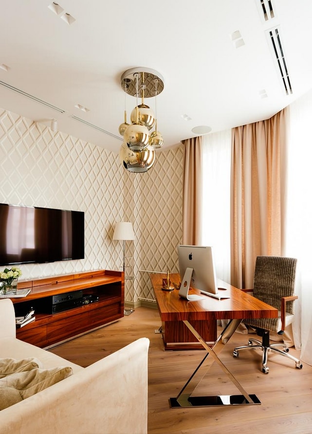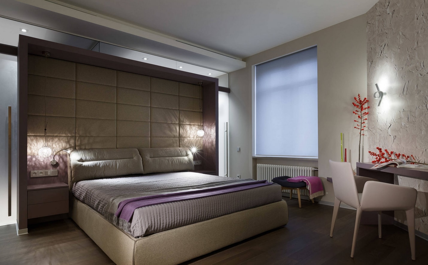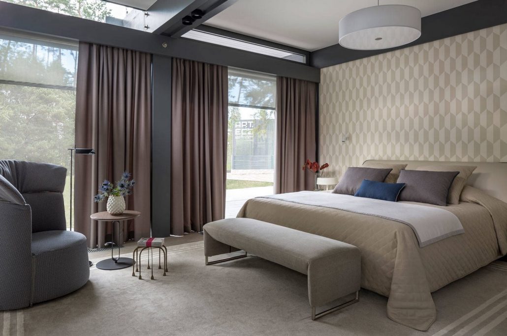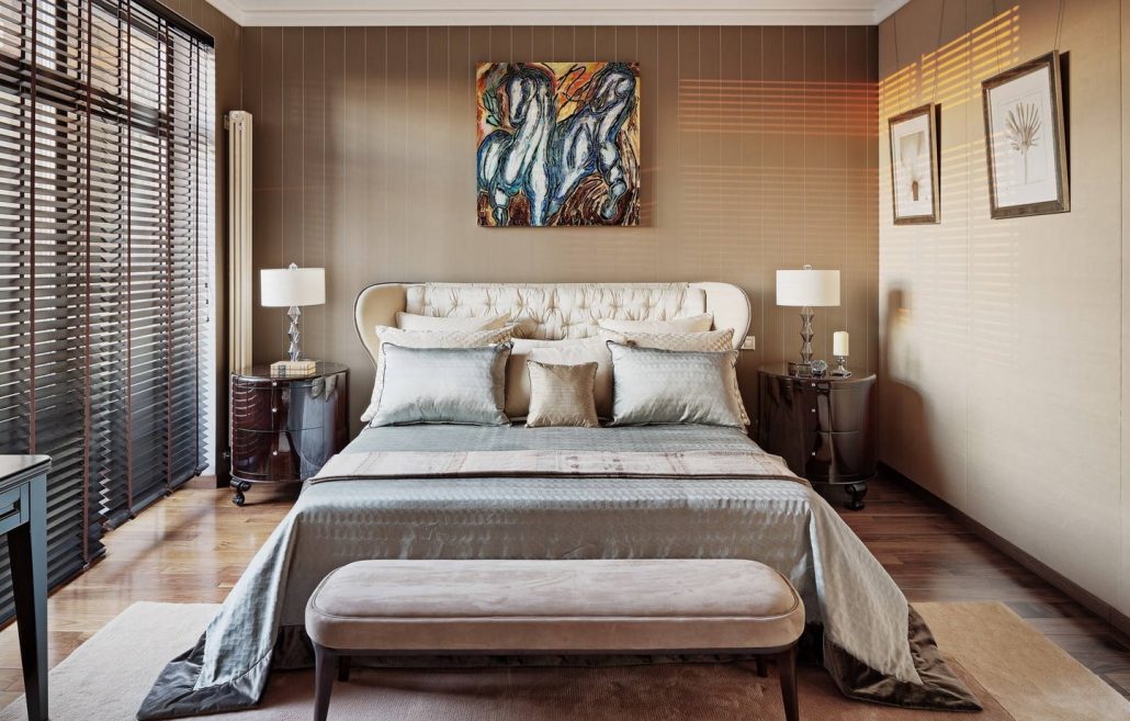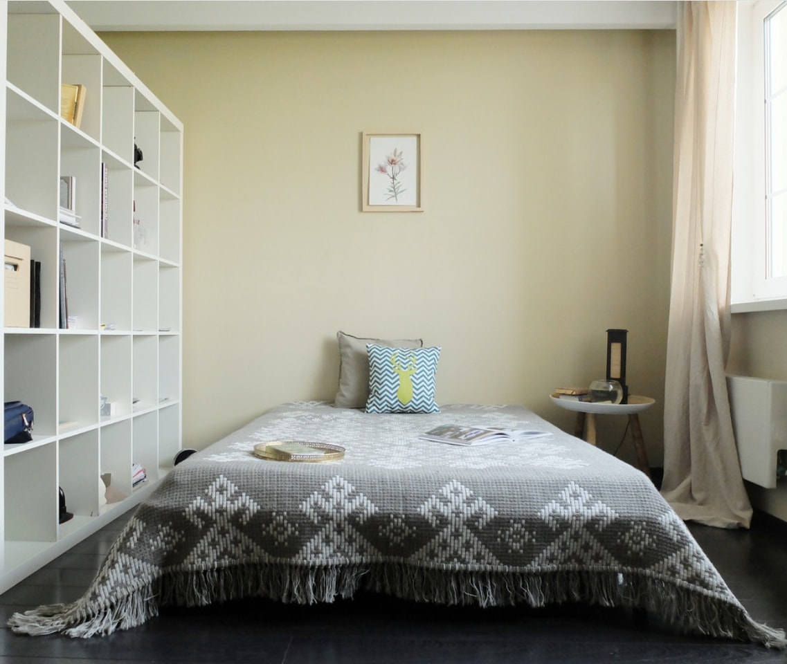 En raison de la possibilité de créer une base pour d'autres couleurs et de la polyvalence dans les chambres à coucher, les murs beiges sont très populaires. Ils peuvent être combinés avec toutes les nuances de violet, turquoise, bleu, marron et gris.