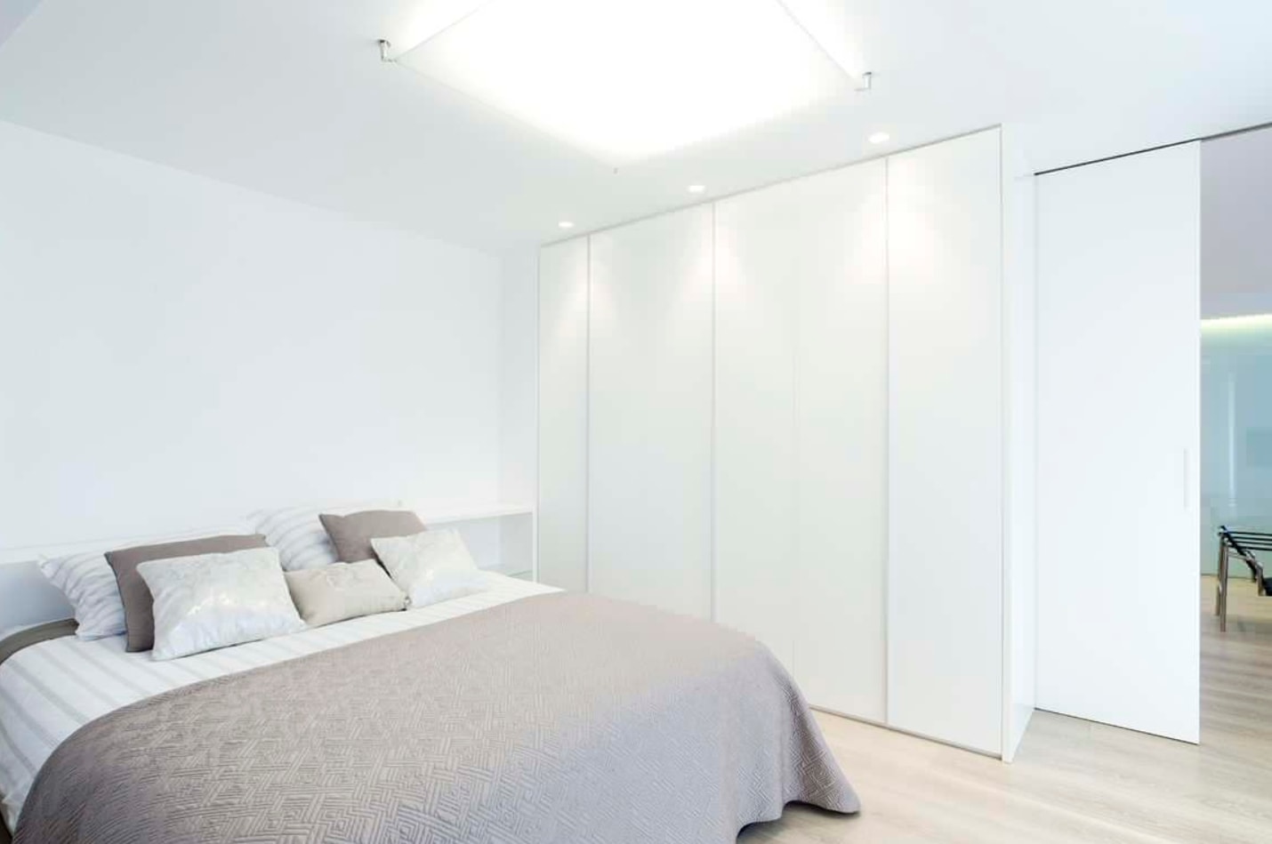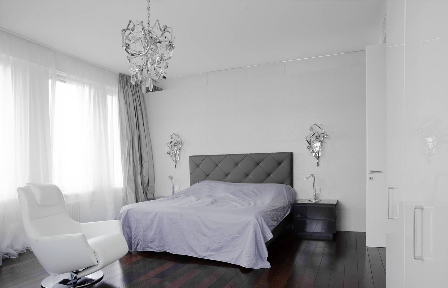 Les murs blancs conviennent aux meubles sombres et clairs. Ils agrandissent visuellement la chambre et se combinent avec tous les styles.