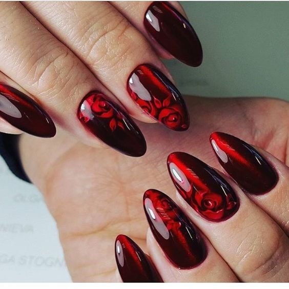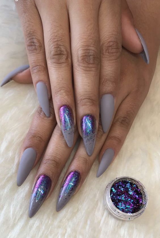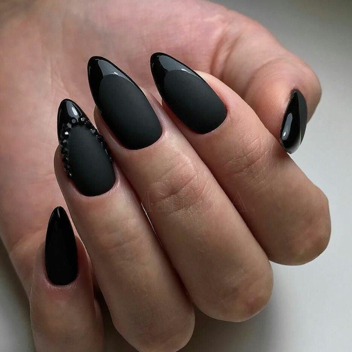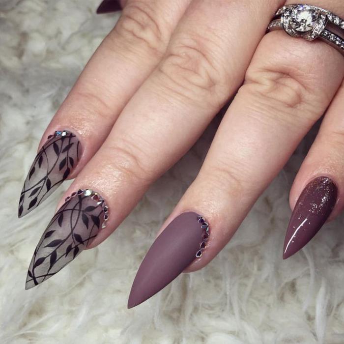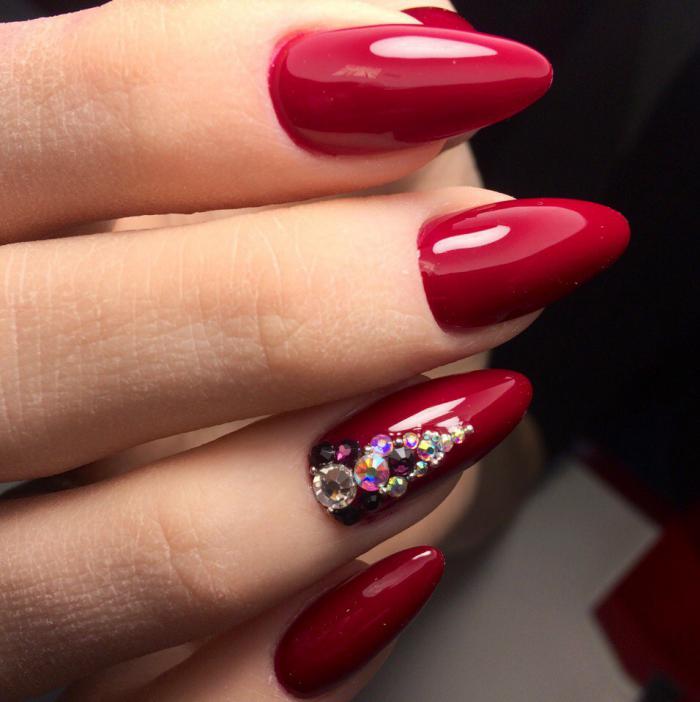 En ce qui concerne les nuances de vernis pour cette forme de clous, il en existe beaucoup en 2026. Tout d'abord, il convient de noter le design dans des tons sombres de violet, rouge, gris, bleu, prune et autres. Cette solution sera la meilleure option pour créer un look de soirée luxueux. Dans le même temps, vous pouvez le compléter en toute sécurité avec un petit décor en forme de strass ou de paillettes. Tout cela sera vraiment approprié.