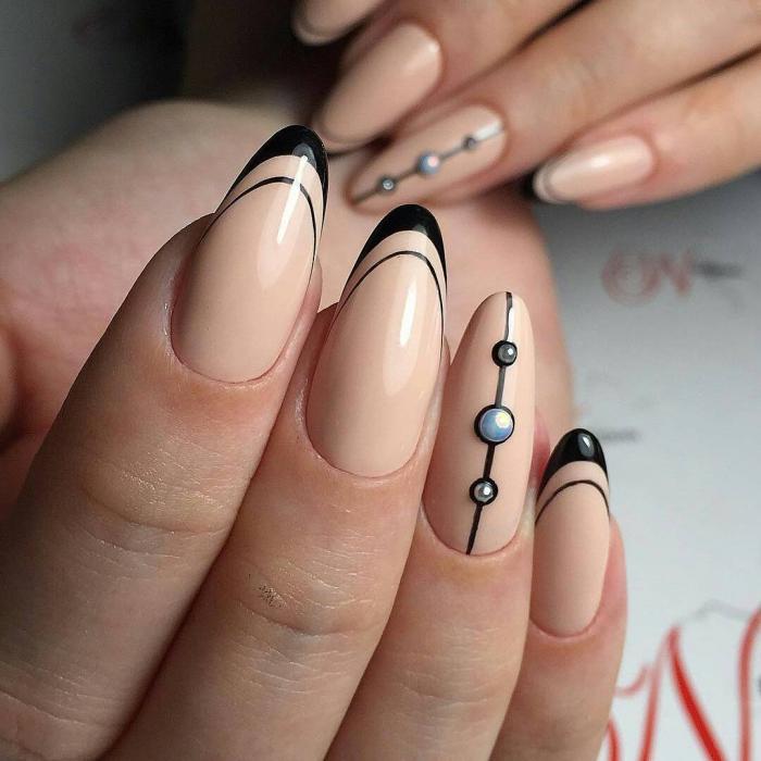 Les amateurs de classiques n'auront pas à se tourner vers d'autres options de design. En effet, en 2026, la manucure française reste toujours en vogue, même sur les ongles longs et pointus. Bien sûr, la plupart des filles ont tendance à prendre la couche de base sous forme de vernis blanc. Mais cette saison, nous recommandons toujours d'aller au-delà du cadre habituel et d'essayer quelque chose de nouveau pour vous-même. Par exemple, utilisez un vernis foncé ou brillant. En général, peu importe lequel. L'essentiel, c'est que cela va bien avec la plupart de vos looks.Le décor peut également être utilisé presque n'importe lequel, mais pas en excès.