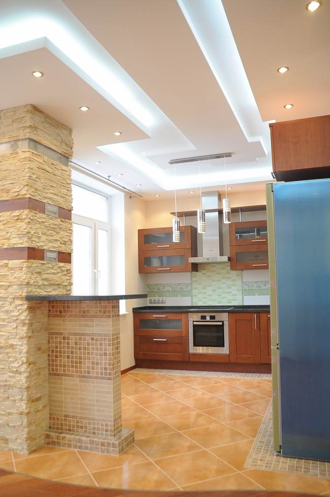 Dans une cuisine avec un plafond peint, une lampe rectangulaire avec une bande LED intégrée aura fière allure. Ce type d'éclairage à dispersion uniforme des rayons est capable d'éclairer toute la cuisine.