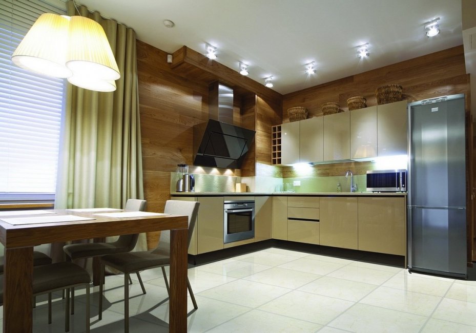 Les propriétaires chanceux d'une grande cuisine peuvent être invités à éclairer toute la pièce avec des lampes à LED pouvant tourner dans différentes directions. L'installation de petits projecteurs sera une option supplémentaire. Ils éclaireront simultanément certains détails intérieurs, ainsi que toute la surface de la pièce.