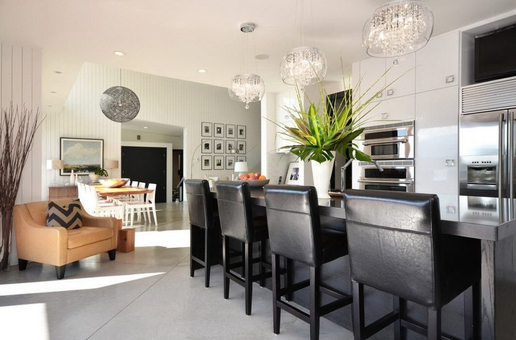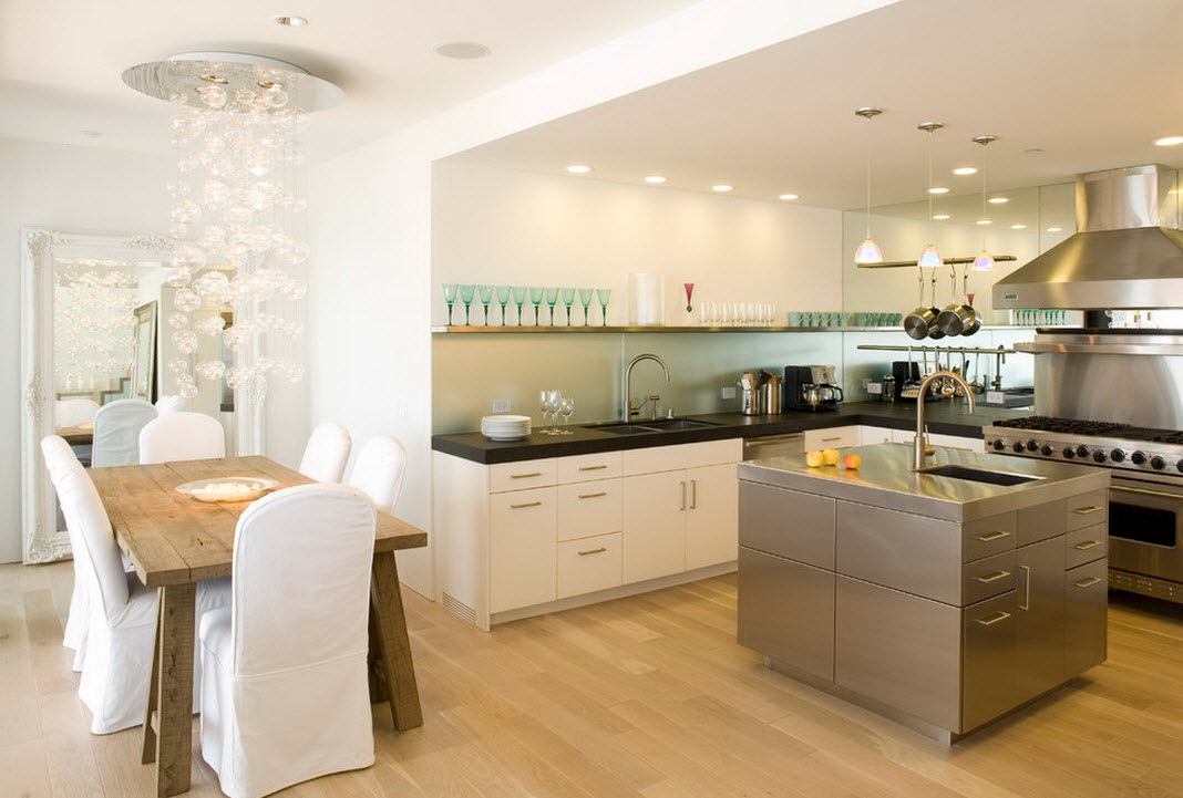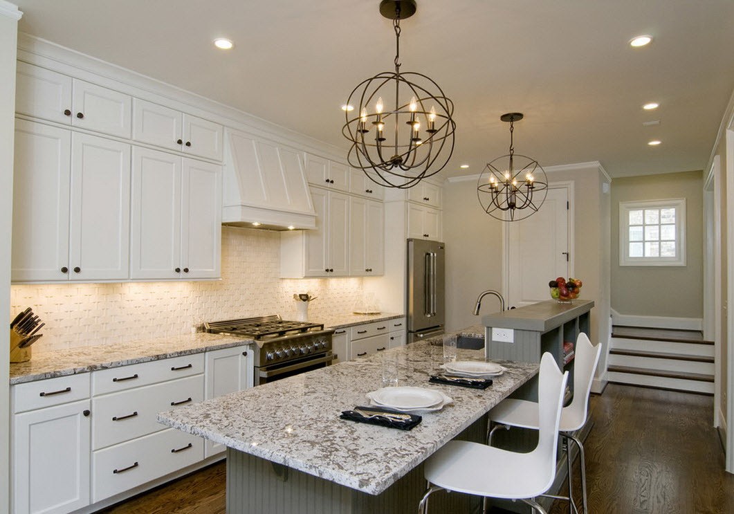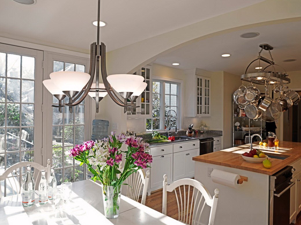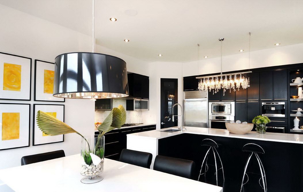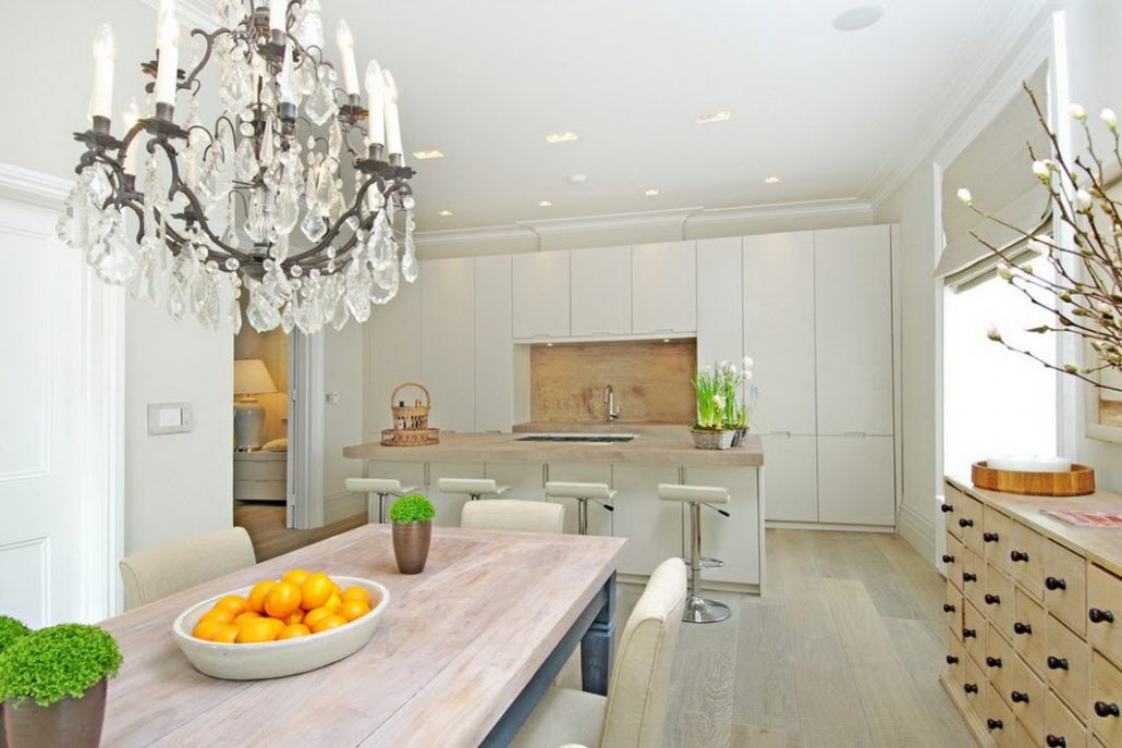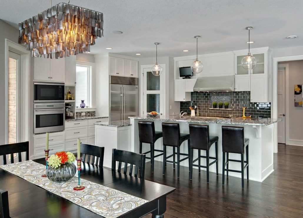 Dans une grande cuisine, un luminaire suspendu contribuera à éclairer certaines zones de la pièce. Les éclairages linéaires à LED ou les lustres à plusieurs lampes conviennent également pour une grande surface.