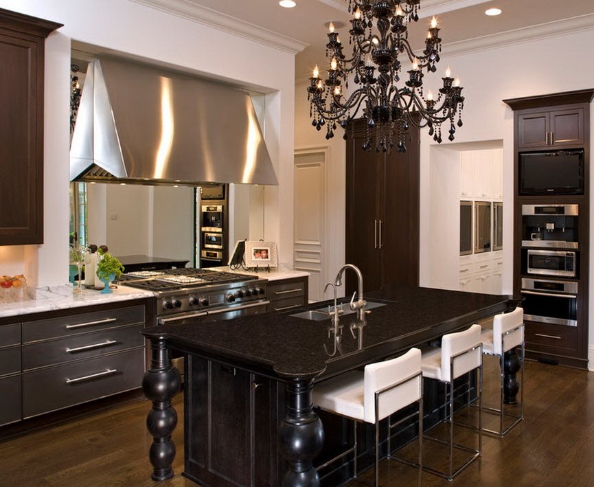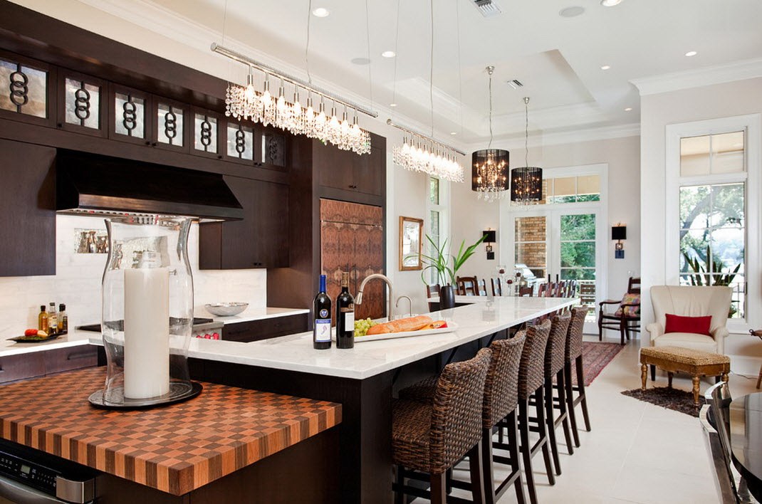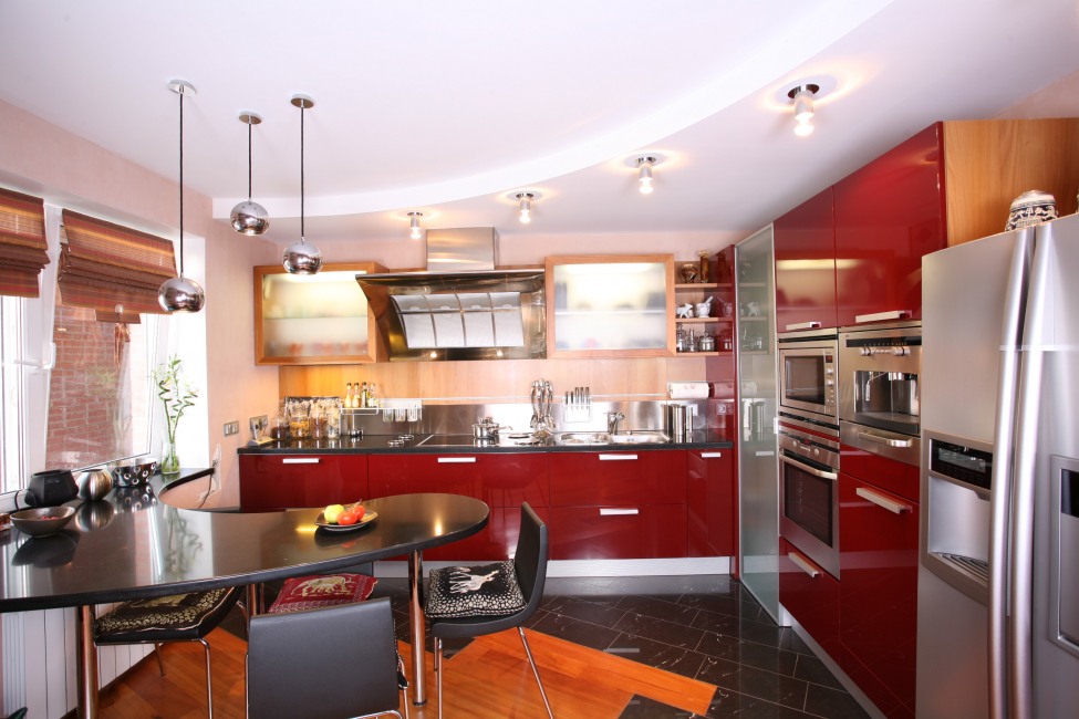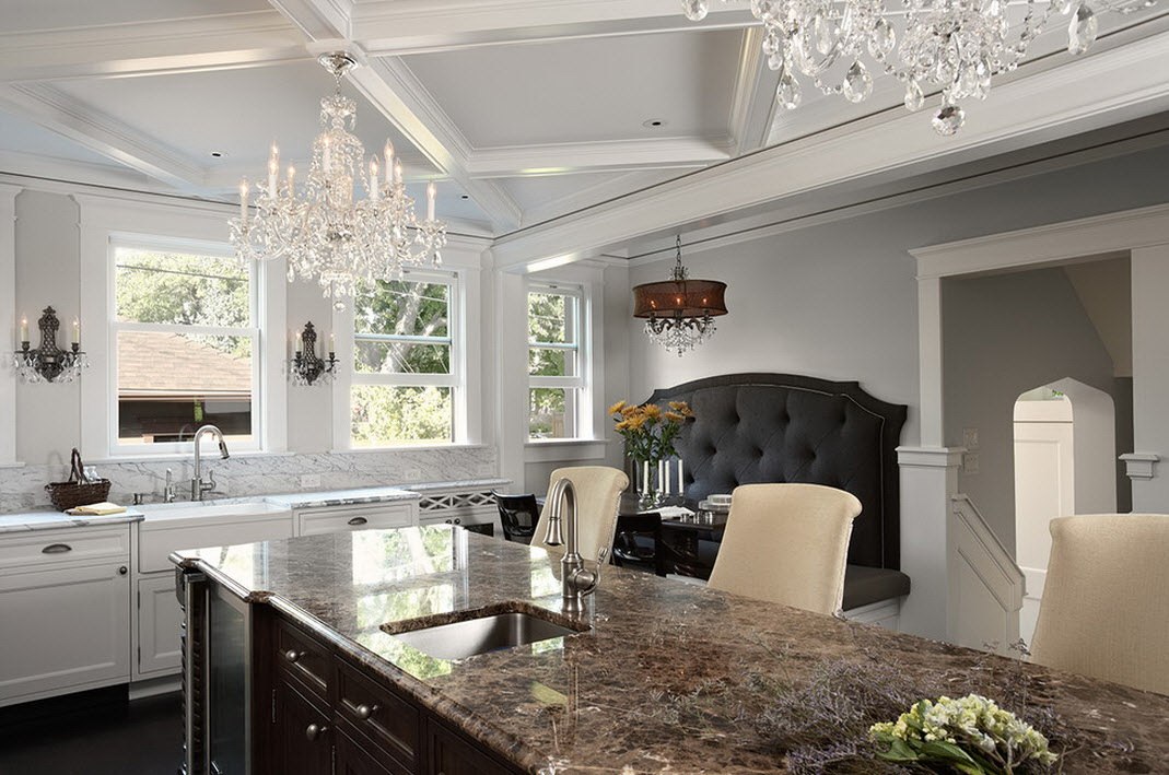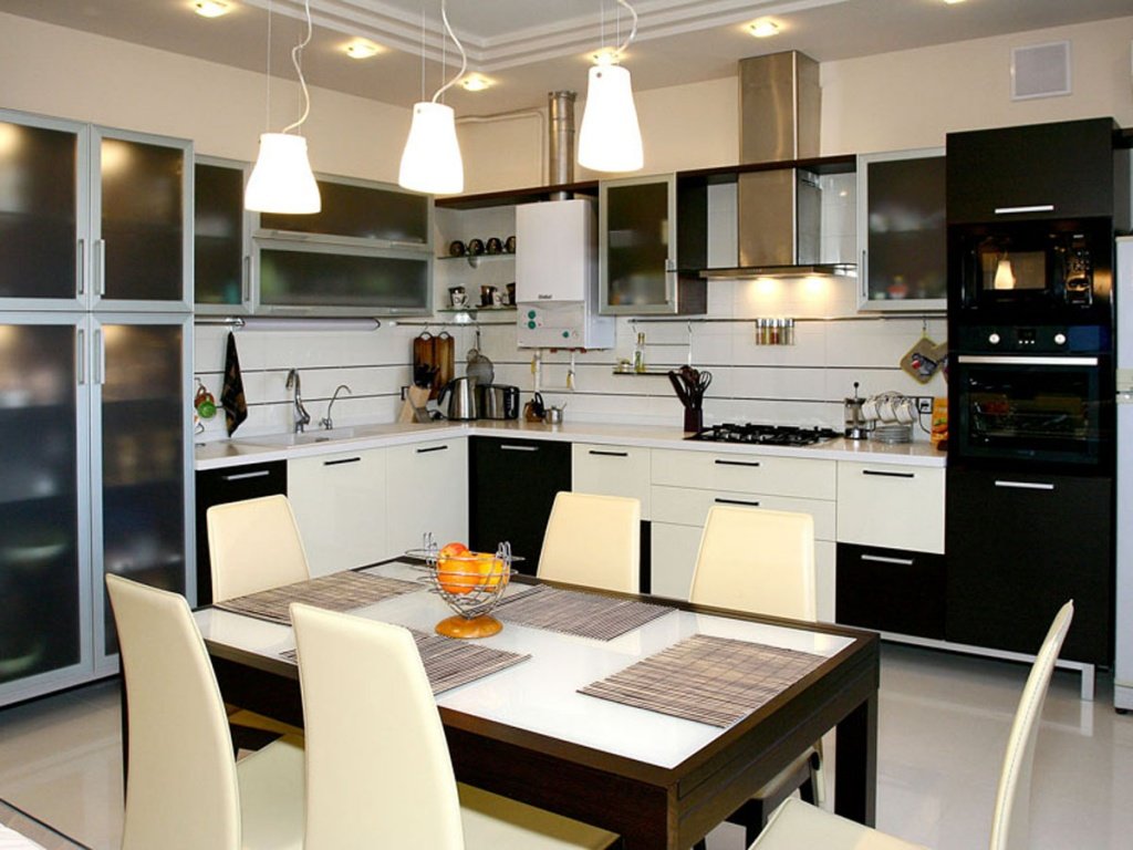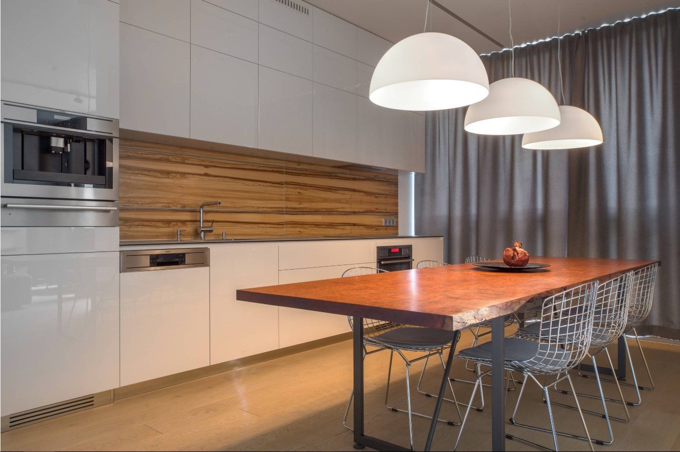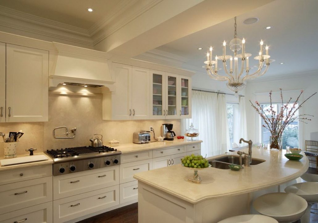 Dans une grande cuisine, un luminaire suspendu contribuera à éclairer certaines zones de la pièce. Les éclairages linéaires à LED ou les lustres à plusieurs lampes conviennent également pour une grande surface.