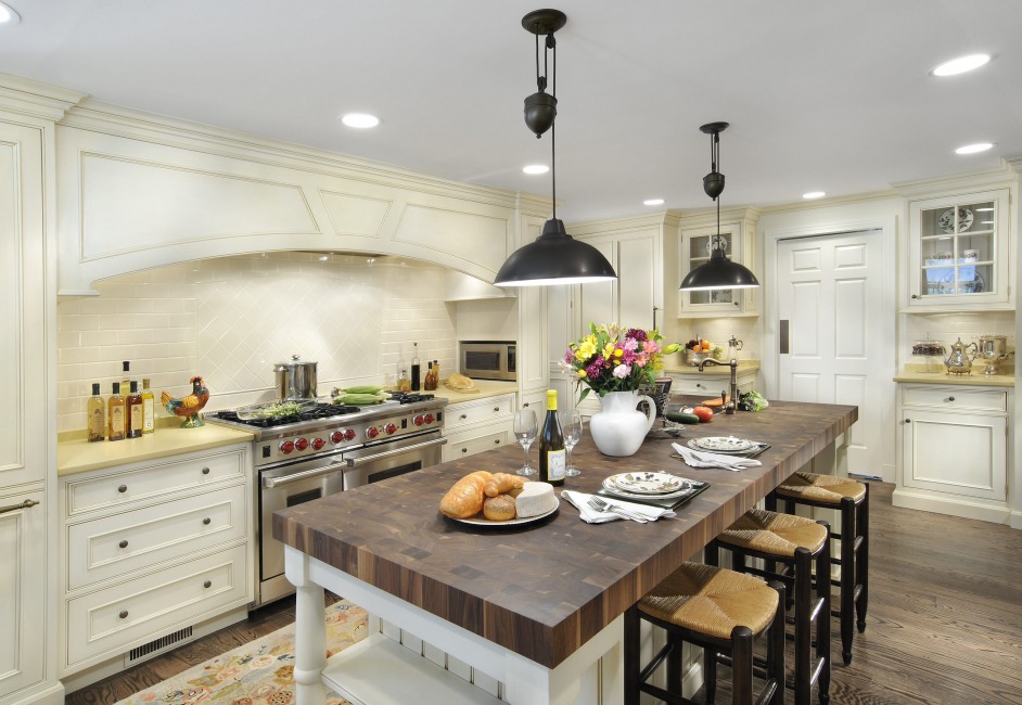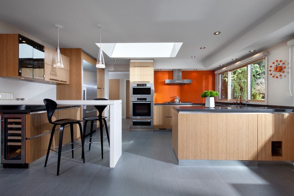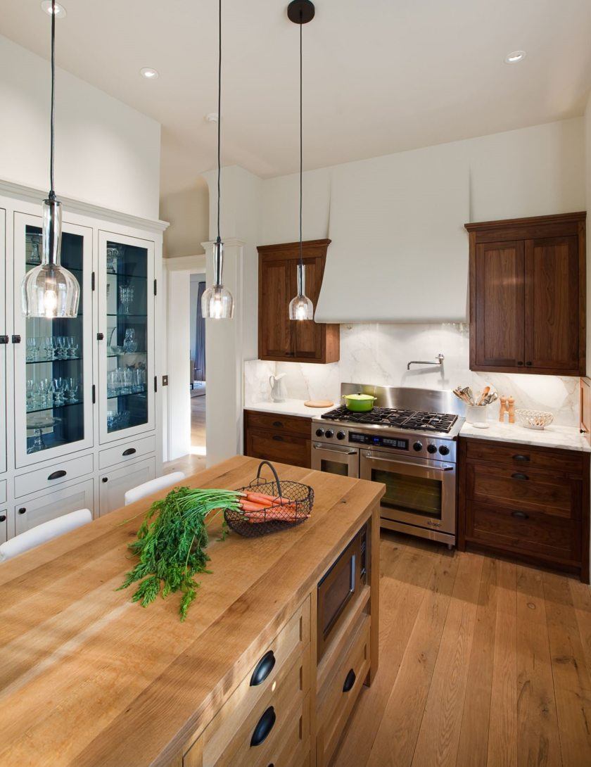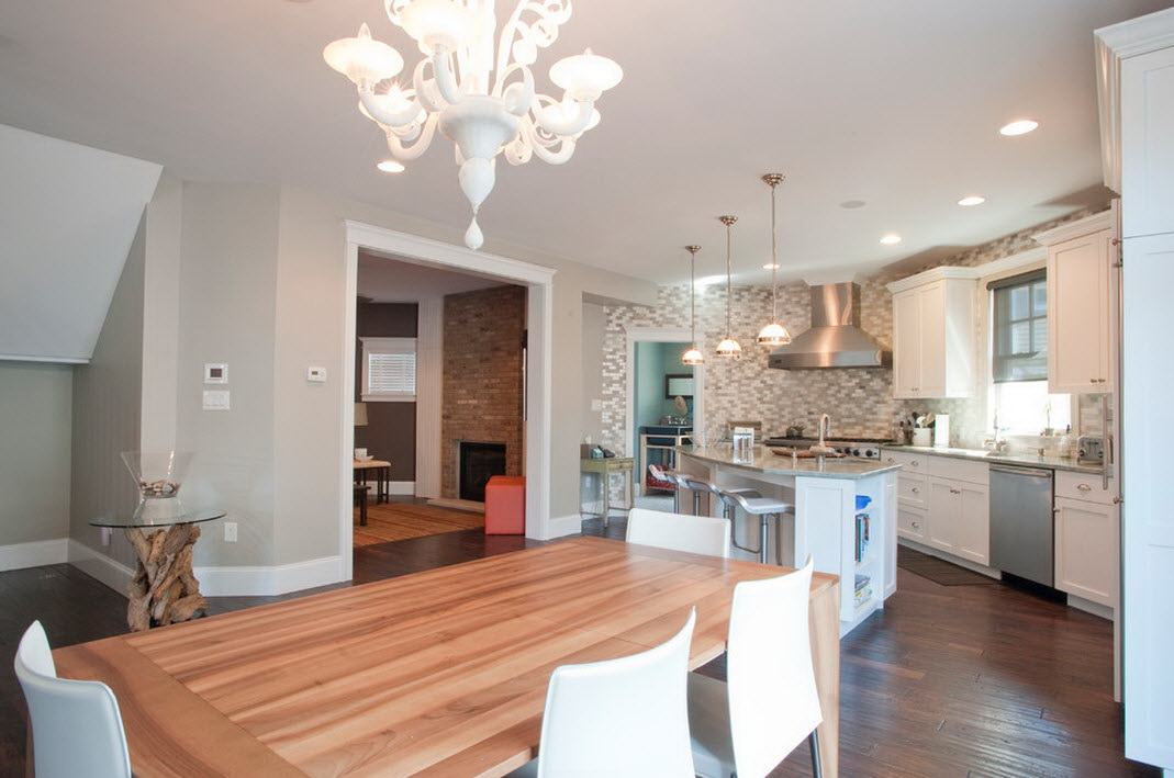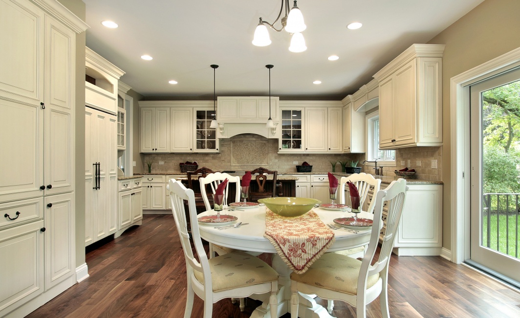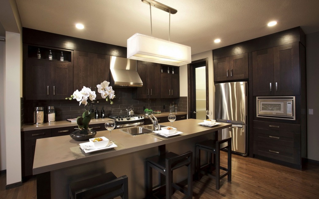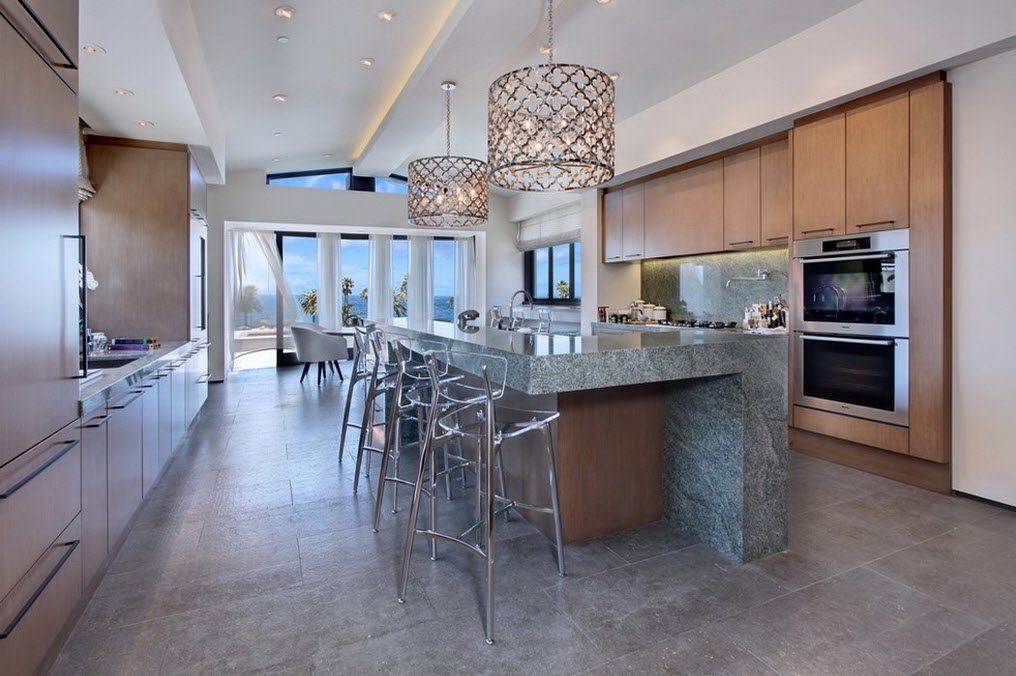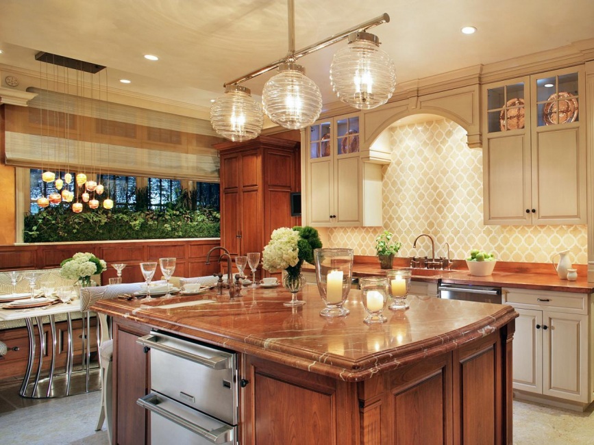 Dans une grande cuisine, un luminaire suspendu contribuera à éclairer certaines zones de la pièce. Les éclairages linéaires à LED ou les lustres à plusieurs lampes conviennent également pour une grande surface.