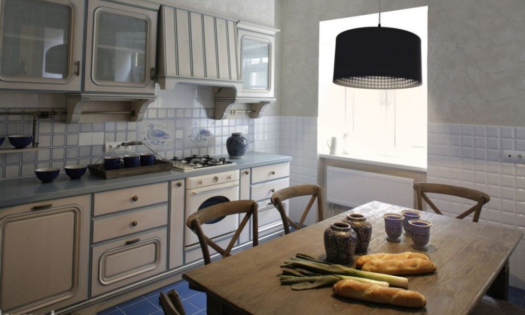 S'il n'y a pas de hotte dans la cuisine, les appareils à LED avec consoles réglables pourront compléter l'éclairage principal. La lumière provenant de lampes pivotantes ne doit pas entrer dans les yeux, vous devez donc utiliser des abat-jours diffusants. La zone de travail de la cuisine nécessite un éclairage intense. Au-dessus de la table à manger, la lumière doit être douce pour ne pas fatiguer la vue.