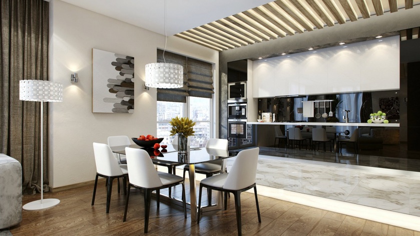 Dans la cuisine, l'éclairage supérieur doit être uniformément réparti sur tous les objets et distribué sur la zone de travail. Une lampe à DEL intégrée serait la meilleure option à cette fin. Il va bien avec les panneaux d'éclairage et les plafonds suspendus.