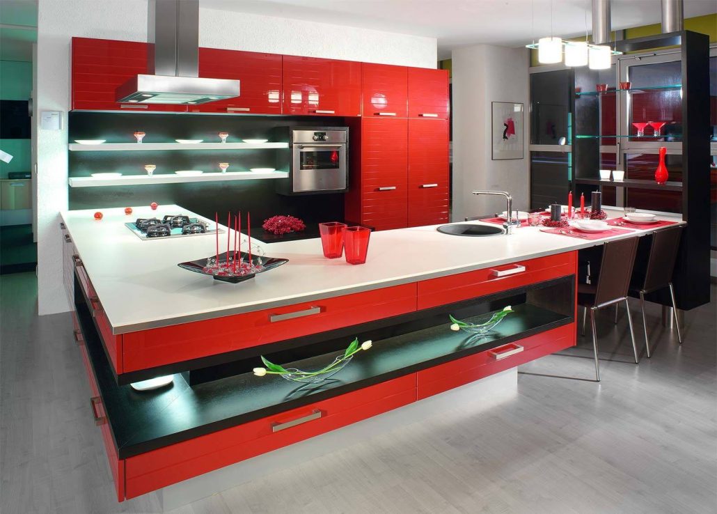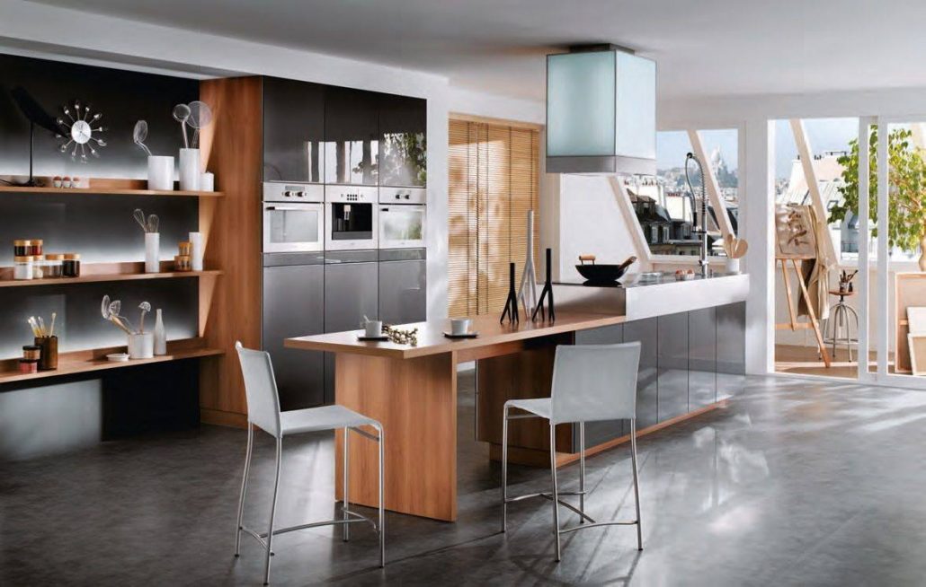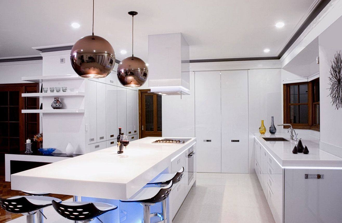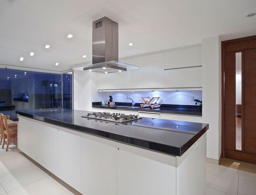 Les cuisines modernes ont beaucoup d'espace. L'éclairage dans eux peut être installé à la fois sur les murs et sur les plafonds. Une hotte aspirante est généralement installée au-dessus du poêle, qui peut être équipé de dispositifs à LED intégrés. Avec la source principale d'éclairage, ils pourront éclairer toute la pièce.