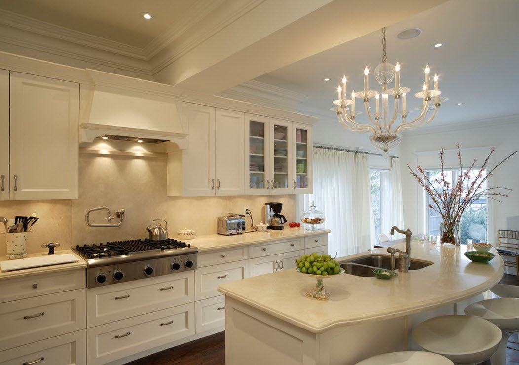 Pour les cuisines où tous les ustensiles sont placés sur des comptoirs, les éléments d'éclairage cachés conviennent bien. L'intérieur peut être complété par des bras de lumière décoratifs. Seulement, ils doivent être sélectionnés dans le style et la couleur. Ils donneront à la cuisine une atmosphère particulière.