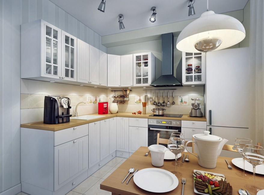 Dans une cuisine de petite surface, des versions uniques et ponctuelles de luminaires sont utilisées. Montage simple sur le bras du pantographe et le support flexible. Cela vous permet de les déplacer dans la pièce. Les projecteurs sont généralement montés sous une mezzanine à charnière ou utilisés dans des luminaires à LED.