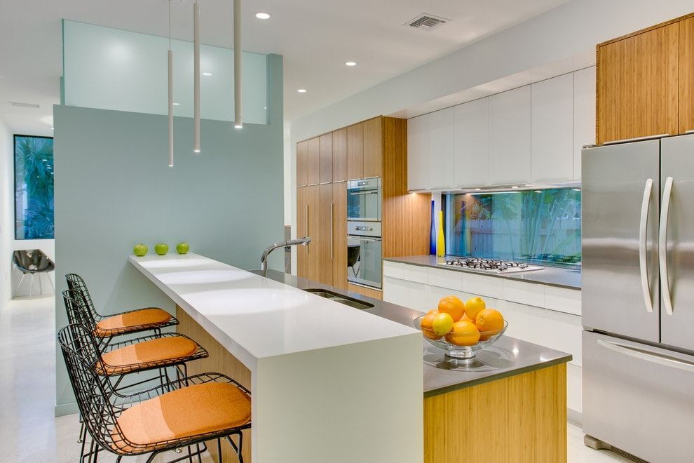 La cuisine peut être divisée en zones pour économiser de l'énergie, éteindre les appareils d'éclairage inutiles et n'utiliser que ceux qui sont nécessaires à un moment donné. Par exemple, n'illuminez qu'un bar ou une table à manger. Cette méthode ajoutera également de la romance à l'intérieur de la pièce.