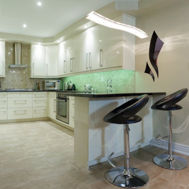 Une bande de LED peut être installée à l'intérieur des armoires. Cette idée convient aux fans de style high-tech. Les appareils d'usage général peuvent éclairer plusieurs grandes zones de travail de la cuisine.