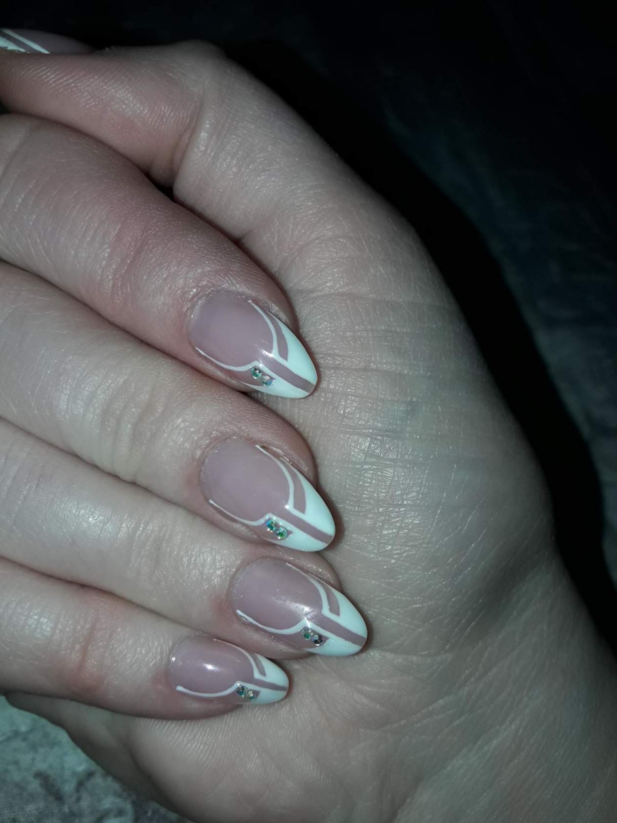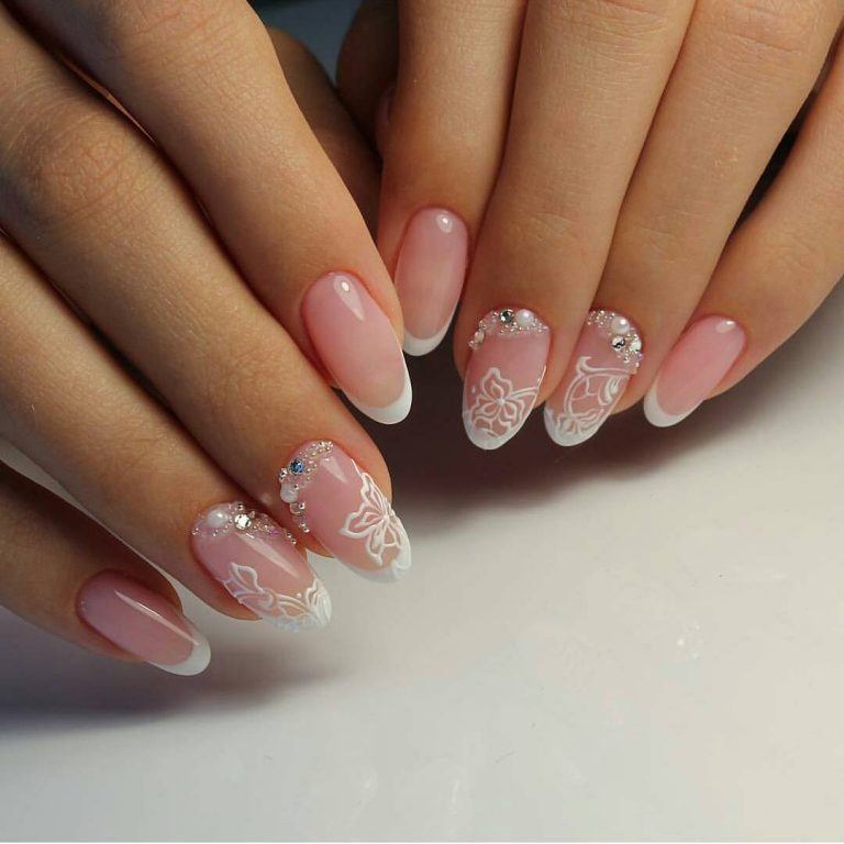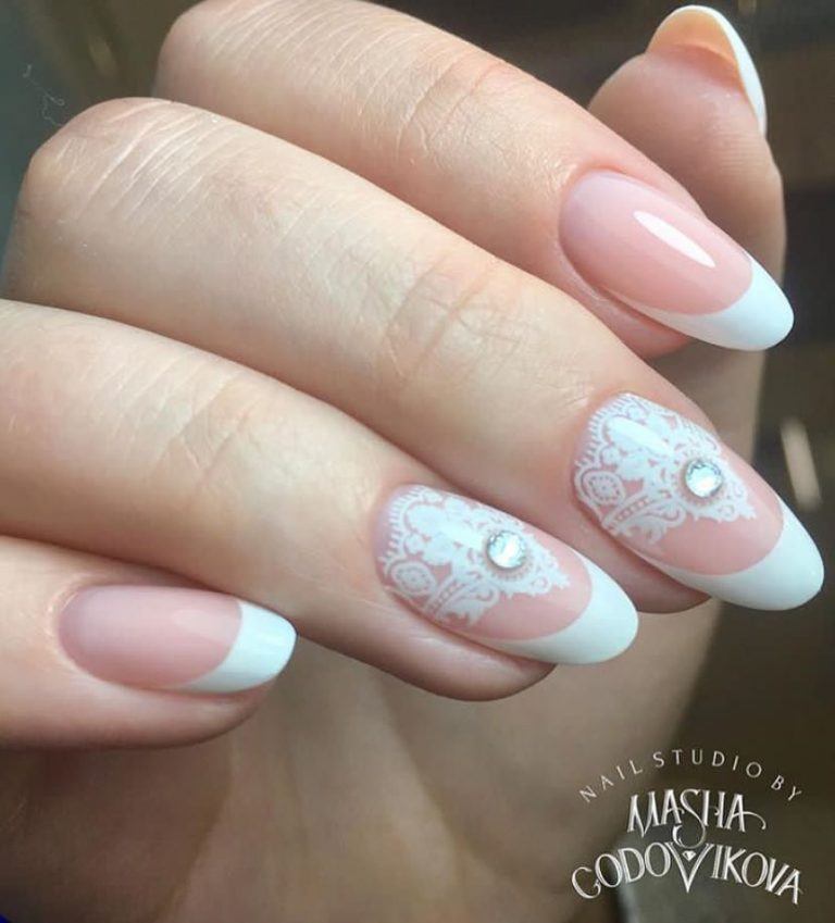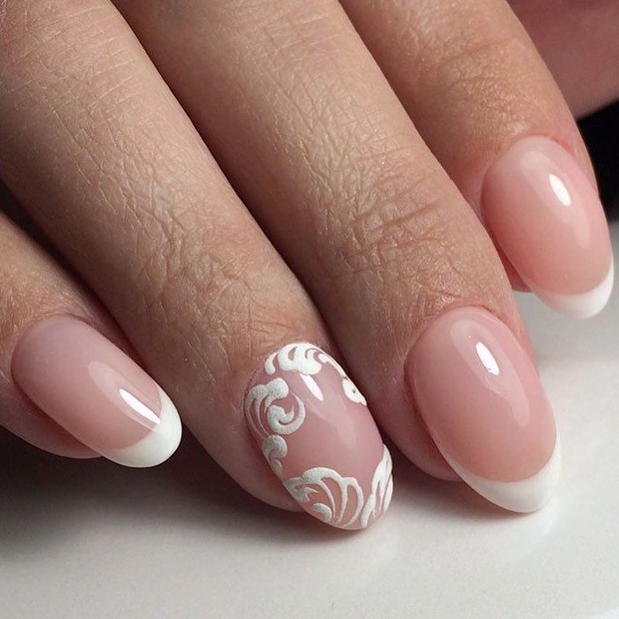 Dans la plupart des cas, la manucure française est réalisée dans une couleur blanche délicate. C'est cette couleur qui peut donner l'image d'une fille innocence et romance. La veste blanche est considérée comme une option universelle, car elle convient à la fois aux vêtements de bureau et aux robes décontractées. Ovale French est entré dans la mode relativement récemment. Par conséquent, les maîtres d'art des ongles utilisent souvent cette forme particulière de veste. Il existe un grand nombre d'idées belles et sophistiquées qui sont parfaitement combinées avec des éléments décoratifs supplémentaires, tels que des fleurs, des strass, des bouillons, des confettis et autres.