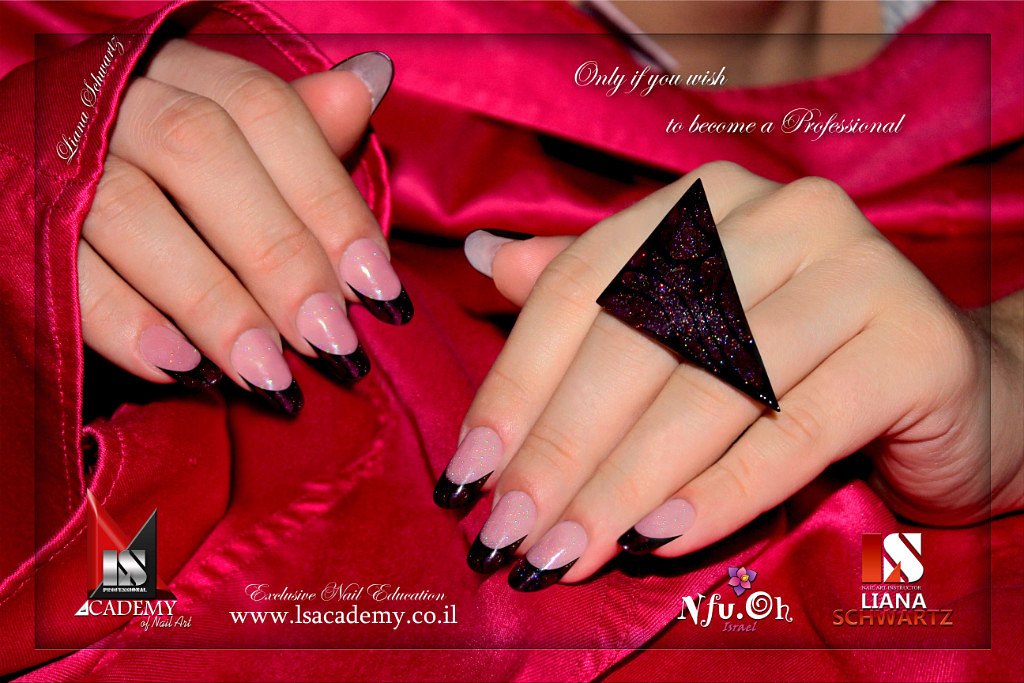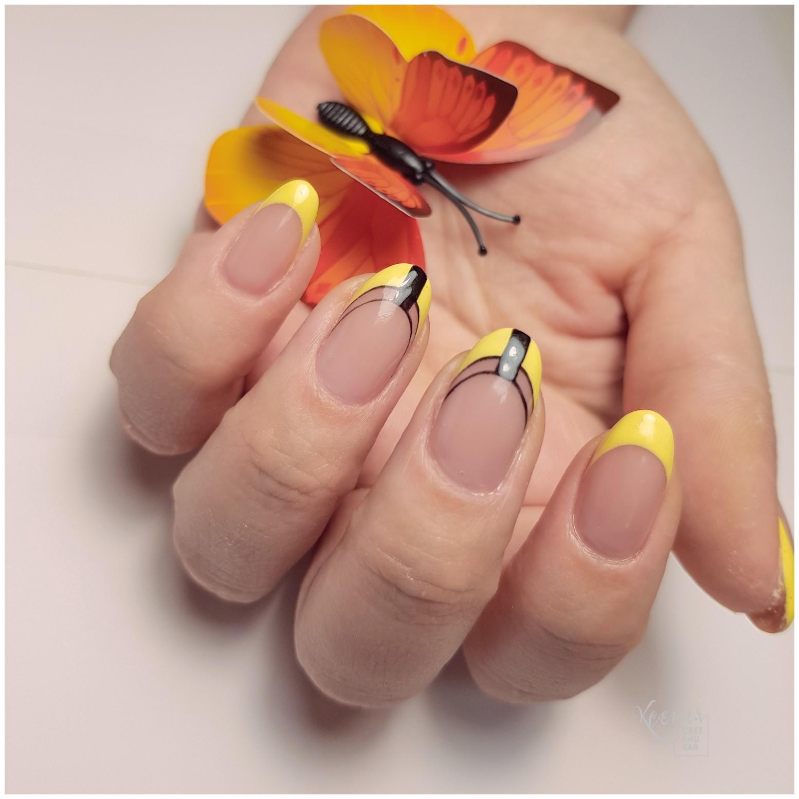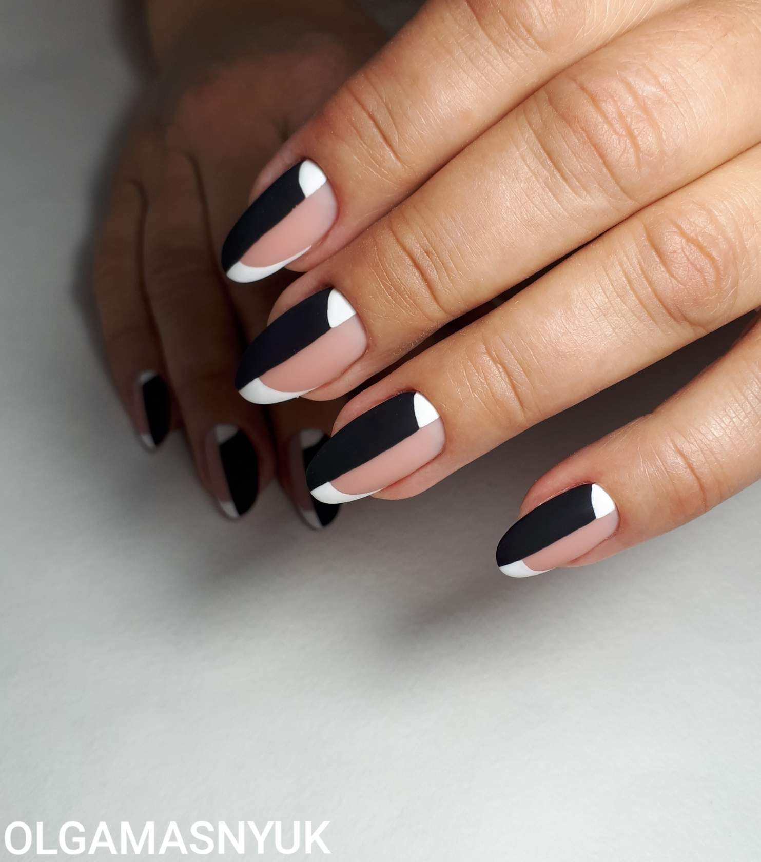 Pour les filles extraordinaires qui aiment effectuer des options de manucure audacieuses et attrayantes, les maîtres d'art des ongles offrent une couleur noire pour la coloration des sourires français. Cette option semble plutôt mystérieuse et inhabituelle. Pour un effet plus modeste, le noir est combiné au blanc. Cette combinaison est très originale sur chaque ongle. Dans ce cas, la moitié du souci est faite de vernis blanc et l’autre est noire.