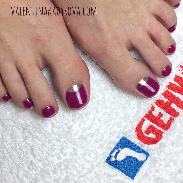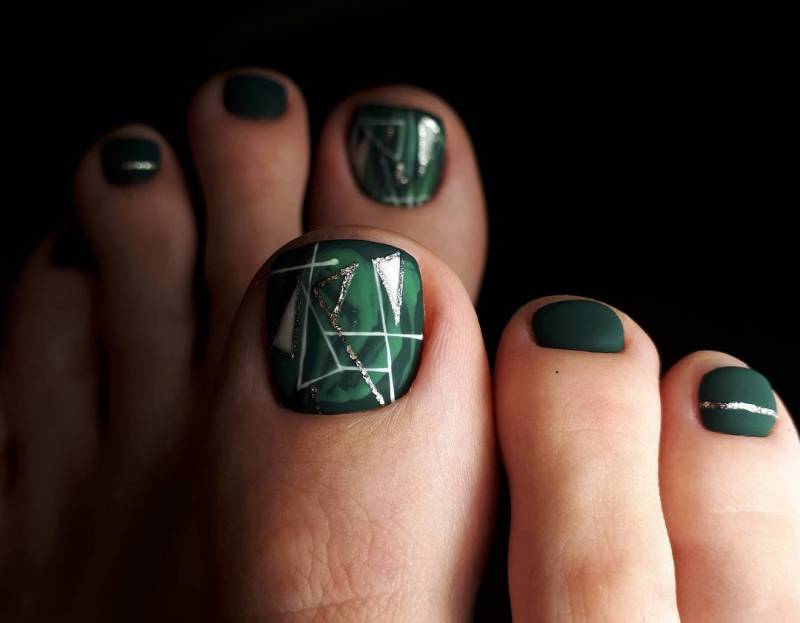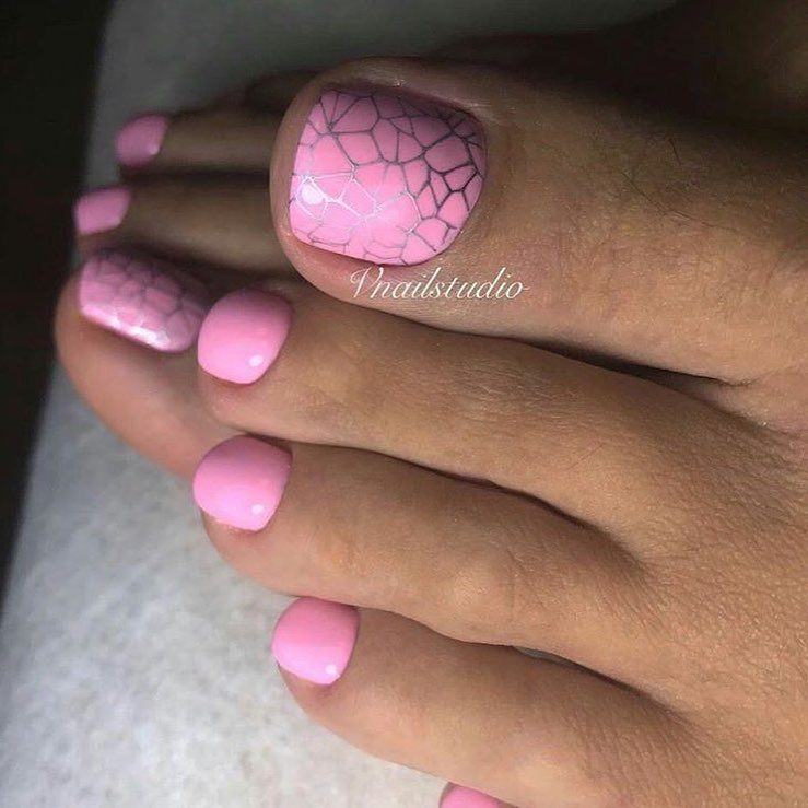 Une autre nouveauté dans la conception estivale de la pédicure est la toile d'araignée. Auparavant, la technique de la ligne d'araignée était utilisée pour créer une belle et intéressante manucure. Aujourd'hui, cette technique est utilisée avec succès pour créer une pédicure tendance. Des motifs inhabituels et attrayants dans le style des toiles d'araignées, réalisés sur un pouce en noir, blanc ou or, vous pouvez diversifier en ajoutant du papier d'aluminium, du kamifubuki ou des strass. Une telle pédicure est incroyablement belle et attrayante en été.