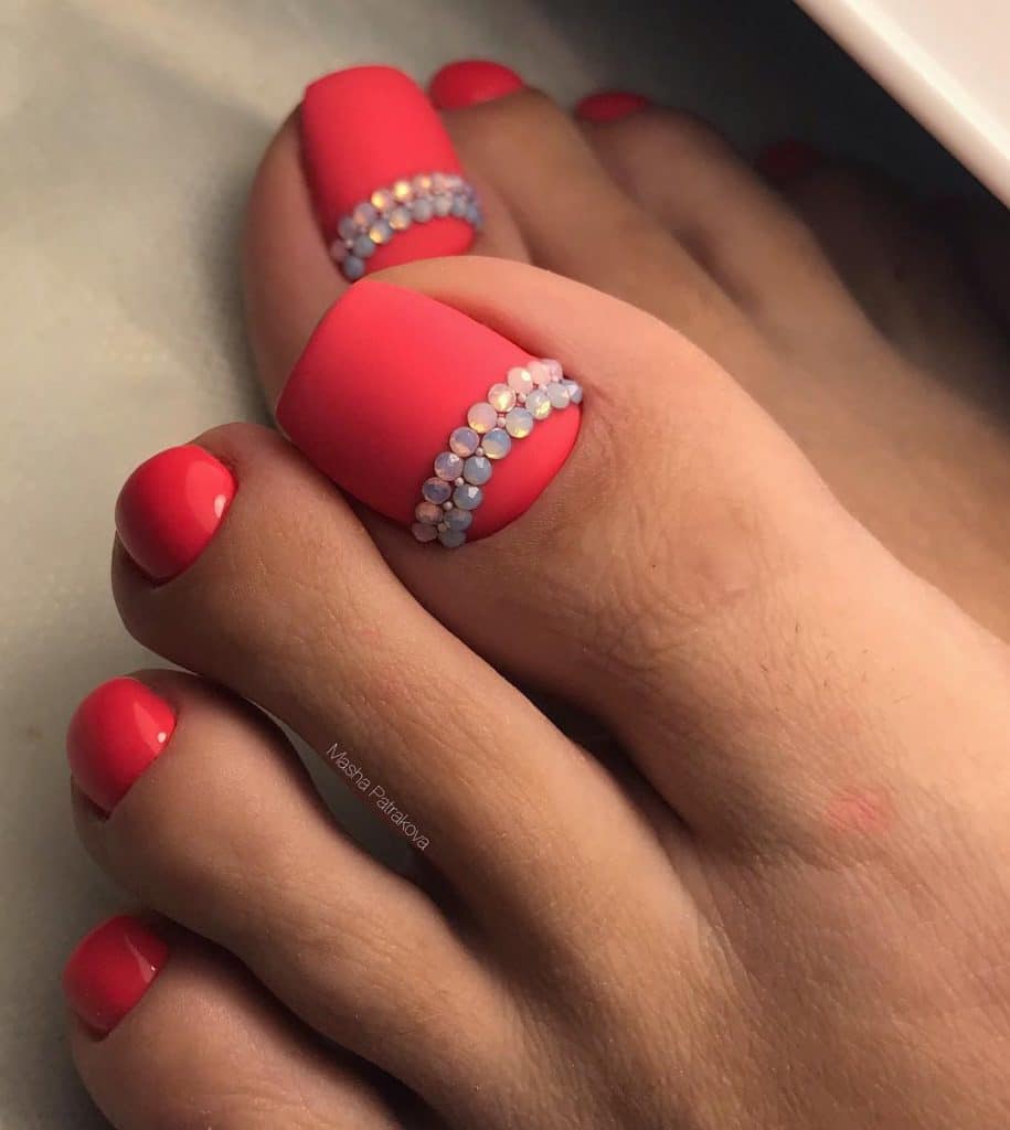 La conception mate de la pédicure estivale donnera un effet spécial. Si vous diversifiez cet art avec des paillettes sur quelques doigts, vous obtiendrez une version gagnant-gagnant de la pédicure estivale. Son fini mat et velours vous permet de créer des solutions de design originales et élégantes pour la pédicure estivale. Bien entendu, une telle technique doit être utilisée pour créer une pédicure à l’été 2026. La conception mate s’allie à merveille avec les combinaisons ombre, veste, motifs et dessins variés, solution de conception néon ou nude, ainsi qu’avec le clinquant et divers strass ou brillants.
