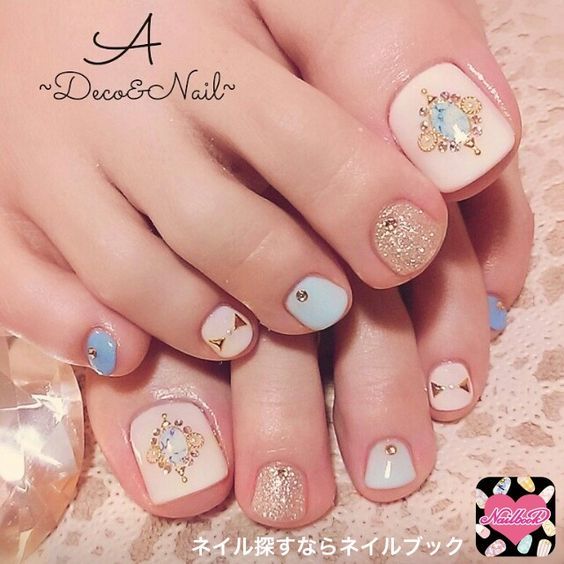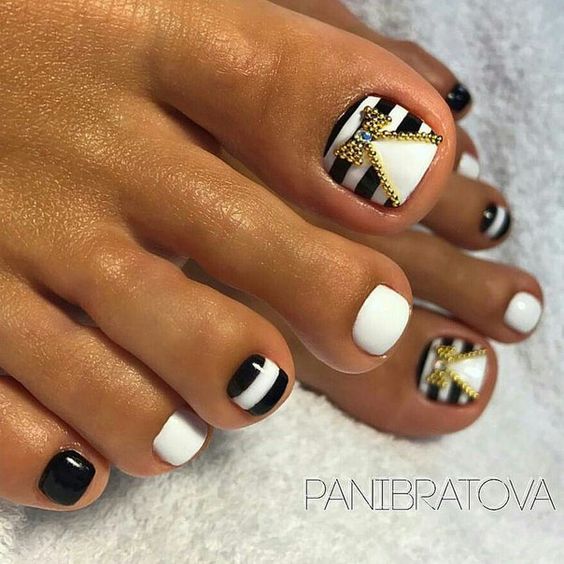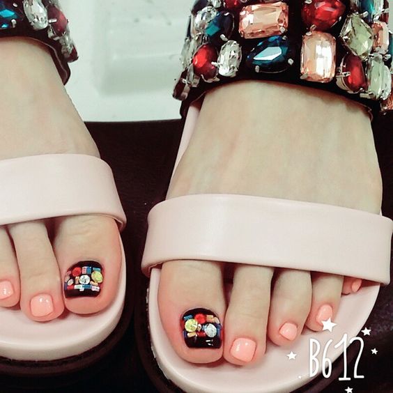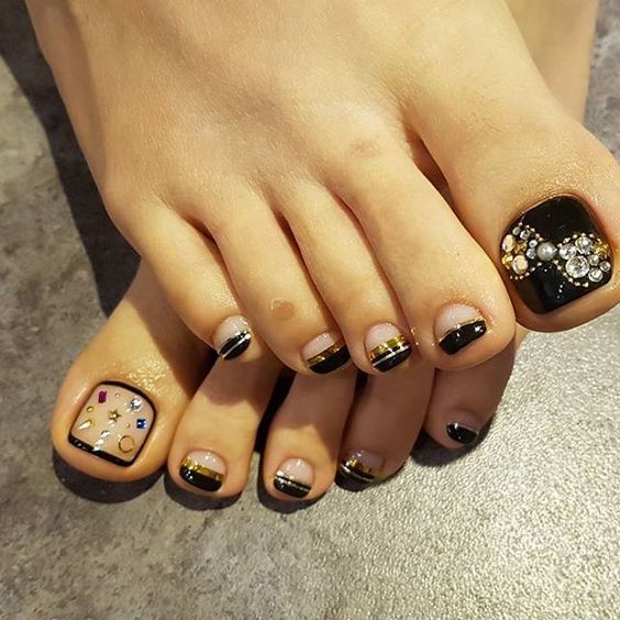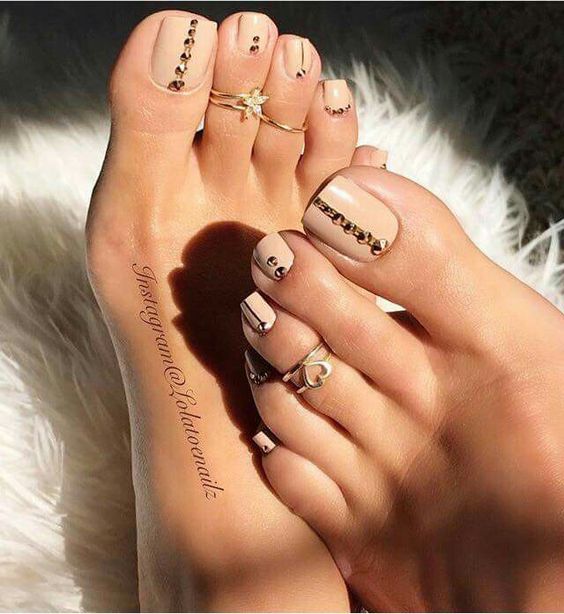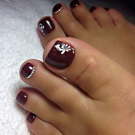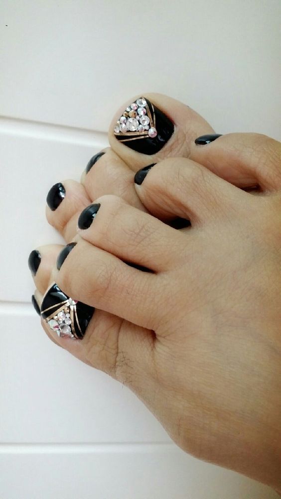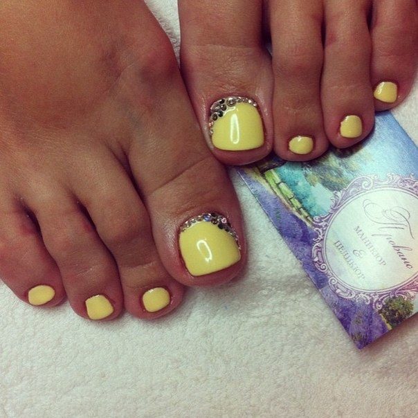 Les strass jouent un rôle important dans la pédicure. De plus, leur emplacement n’est absolument pas fondamental. Les strass sont beaux à la fois sur un ongle et sur tous. En plus de ces éléments de décoration, diverses paillettes peuvent également être utilisées comme décoration. Après avoir complété une pédicure monochromatique par au moins un caillou, vous transférez automatiquement le dessin des ongles de la catégorie ennuyeux à la catégorie attrayant.